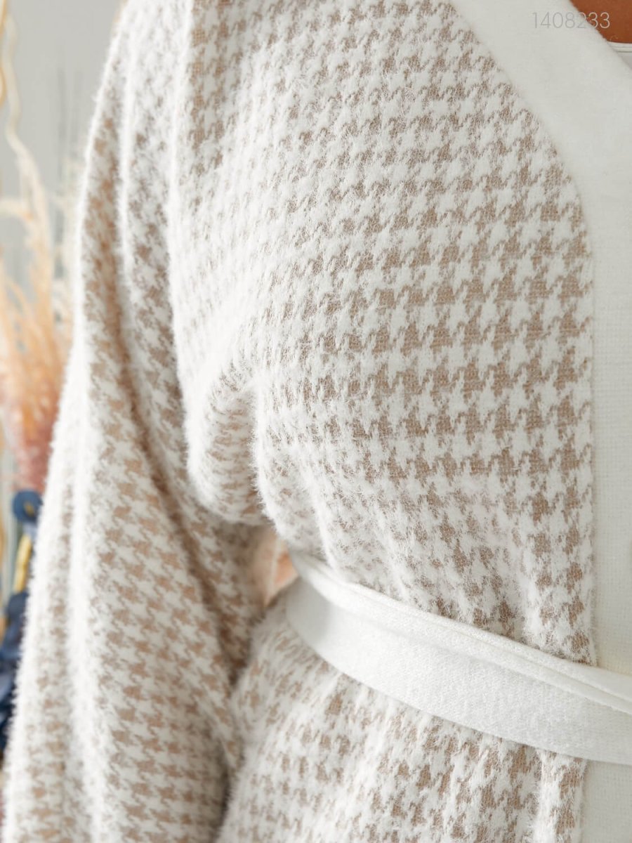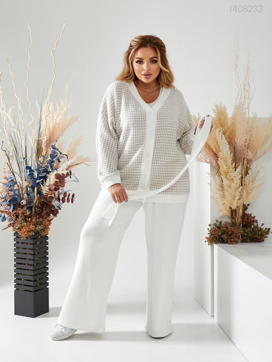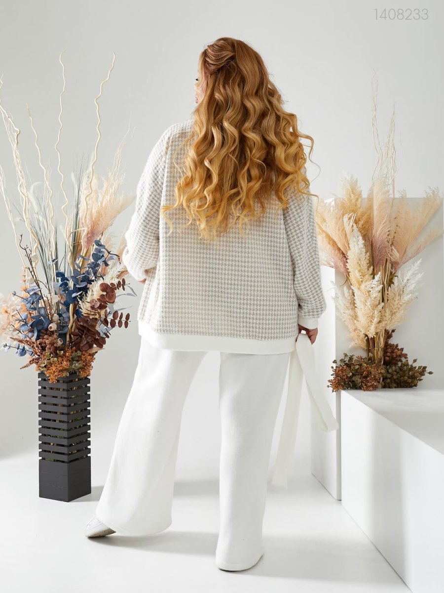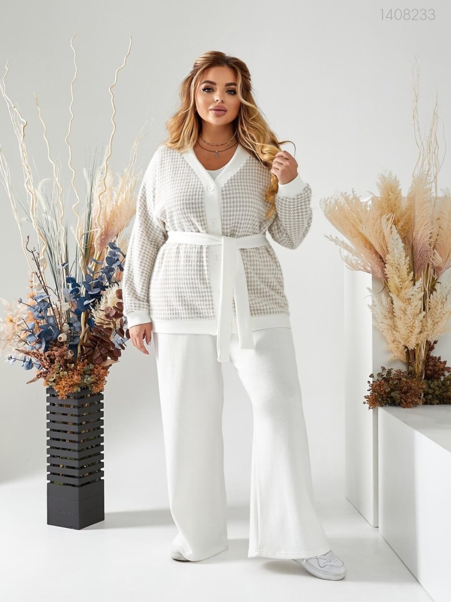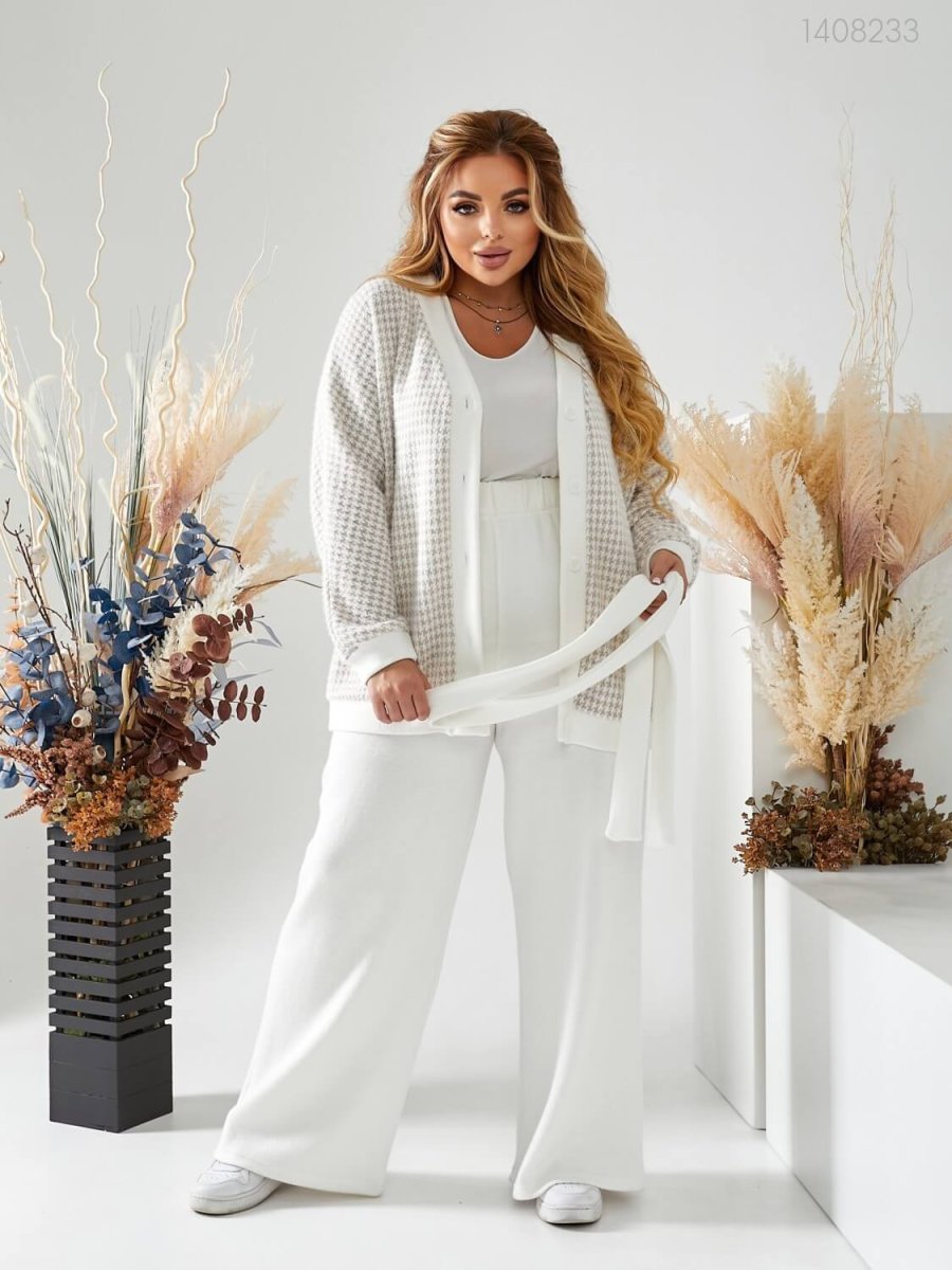 Подробности: кардиган свободного кроя на пуговицах с поясом. Брюки-палаццо высокой посадкой с поясом на широкой резинке, глубокими вместительными карманами.