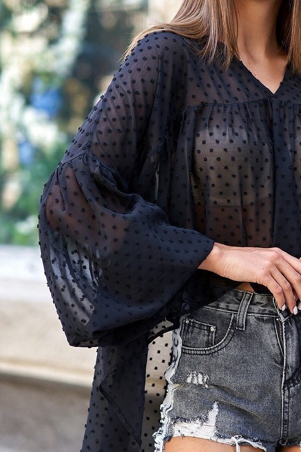 Нежная шифоновая блуза свободного силуэта – такая летняя блуза должна быть на вооружении у каждой модницы. Модель отменно скрывает недостатки фигуры, не сковывает движений, дает ощущение легкости. Такой наряд можно носить в самую знойную погоду, поскольку шифон прекрасно пропускает воздух, Вы будите чувствовать себя комфортно под палящим летним солнцем. Однотонные шифоновые блузки прекрасно сочетаются с брюками или юбками ярких цветов. Особой элегантности и грациозности можно добиться при сочетании шифона с плотной тканью, кожей, трикотажем и даже с атласом. Удлиненная спинка, шикарный рукав внизу с фонариком на резинке, V - образное оформление горловины - особенности новой модели.