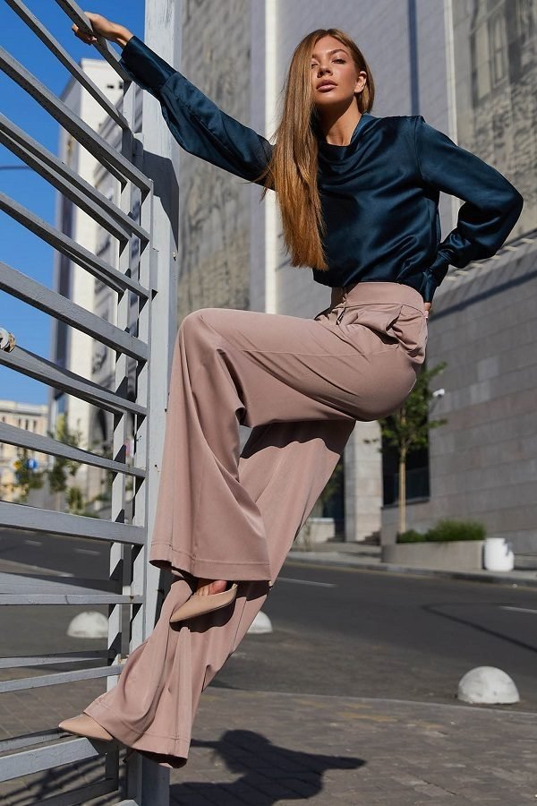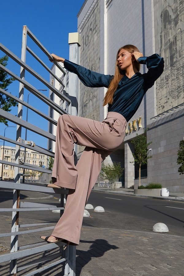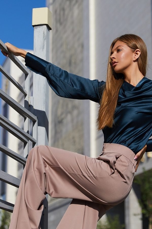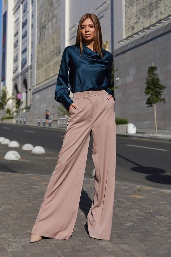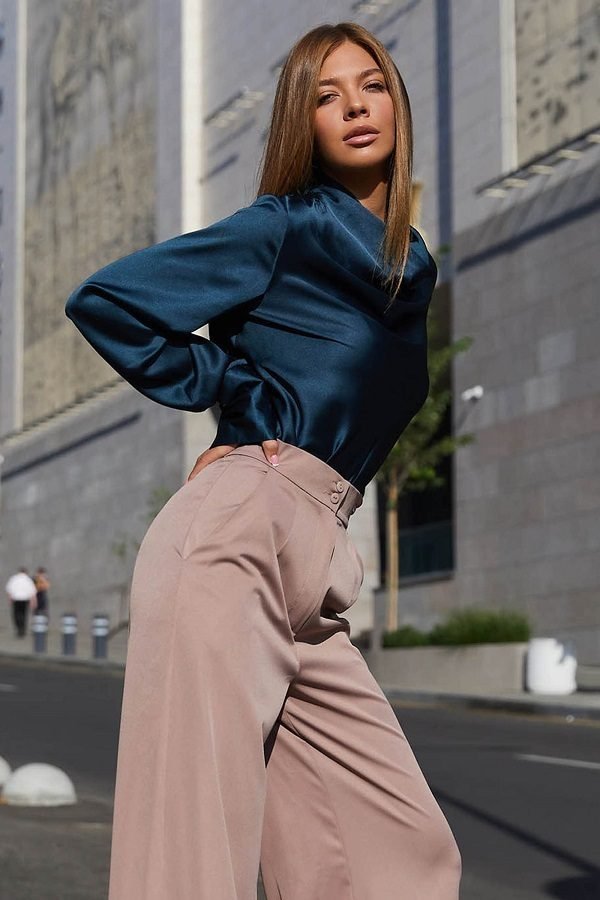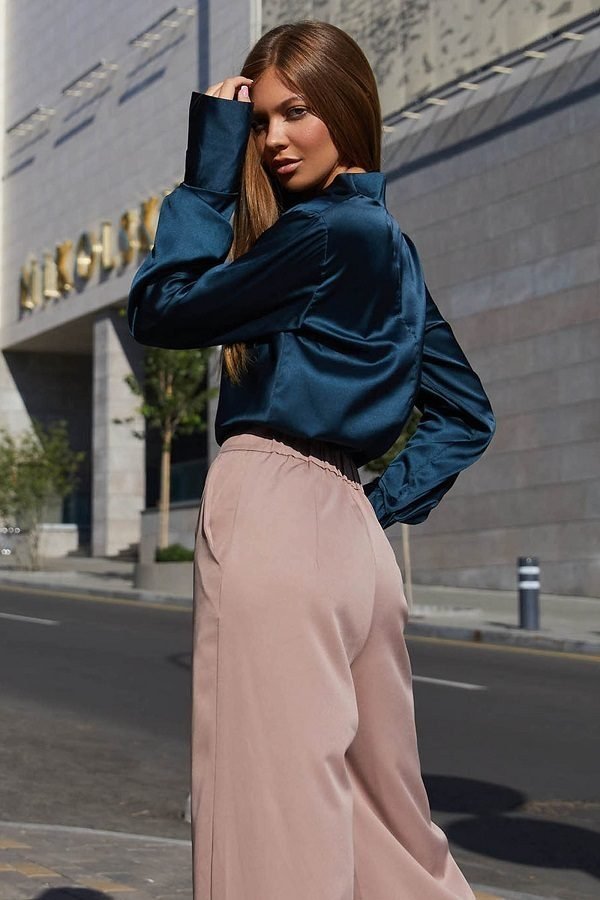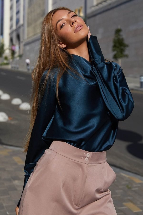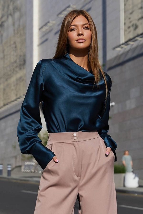 Красивая блуза из шелковой ткани. Горловина изделия выполнена в стиле хомут создавая на груди роскошные волны с блеском ткани. Длинный рукав с высоким манжетом застегивающимся на пуговицу добавляет воздушности. Модель отлично комбинируется с брюками и юбкой, придавая образу делового или вечернего стиля.
