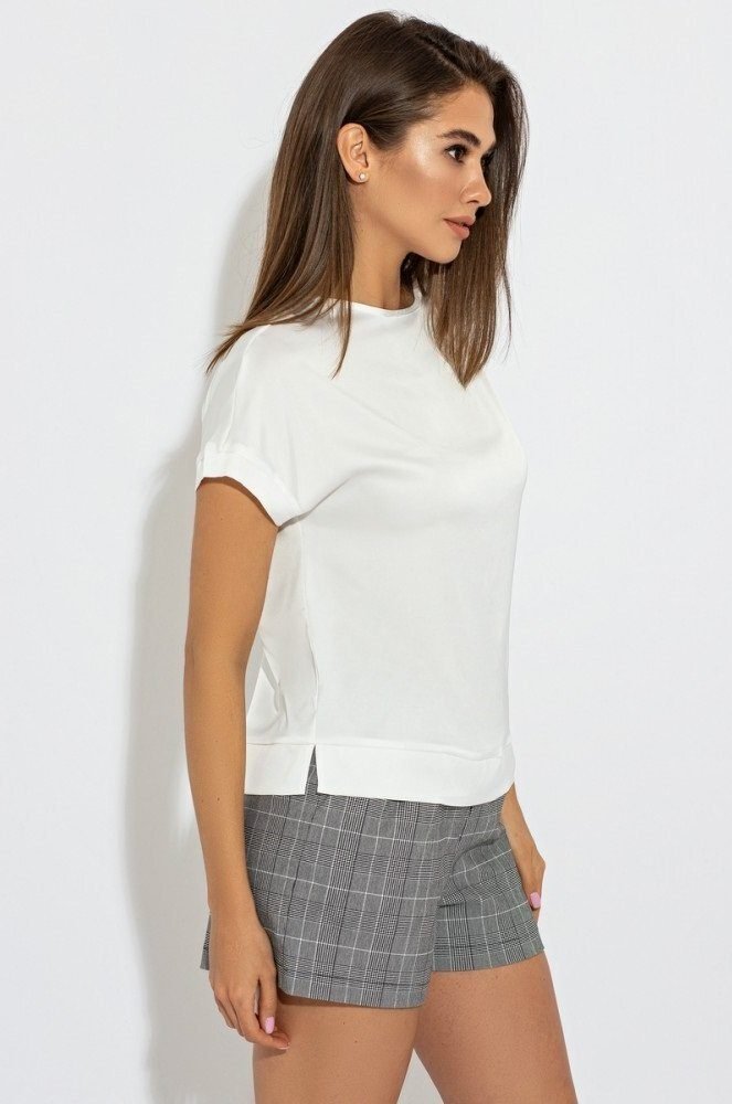 Однотонная блузка прямого кроя из легкого искусственного шелка. По бокам блузы небольшые разрезы, рукава с фиксированными отворотами.