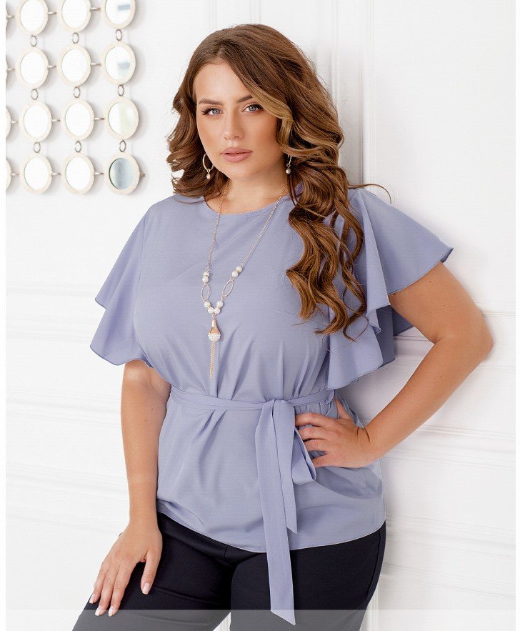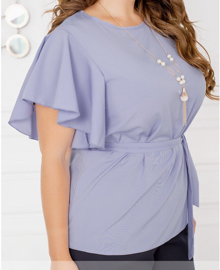Элегантная и минималистичная блуза плюс сайз с рукавами-крылышками, спадающими мягкими оборками. На груди вытачки, застежек и карманов нет, вырез горловины полукруглый. На талии по бокам подшиты шлевки для пояса.