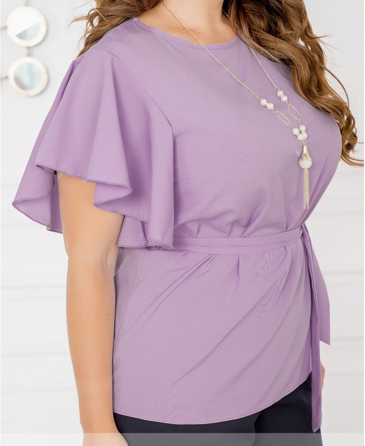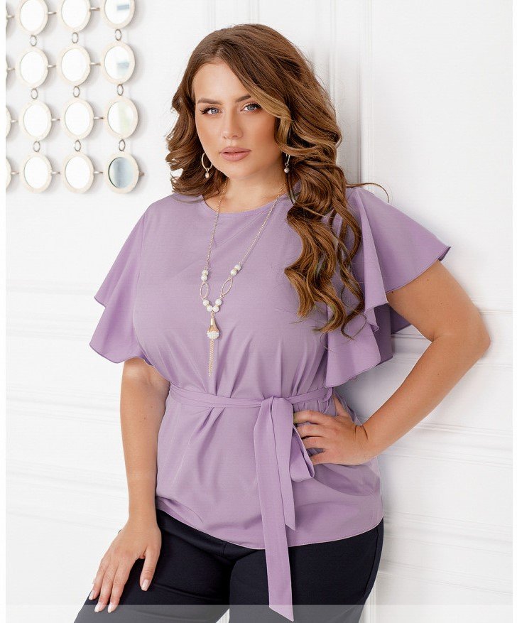 Элегантная и минималистичная блуза плюс сайз с рукавами-крылышками, спадающими мягкими оборками. На груди вытачки, застежек и карманов нет, вырез горловины полукруглый. На талии по бокам подшиты шлевки для пояса.