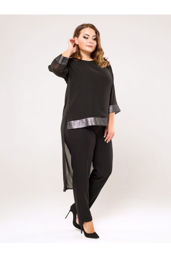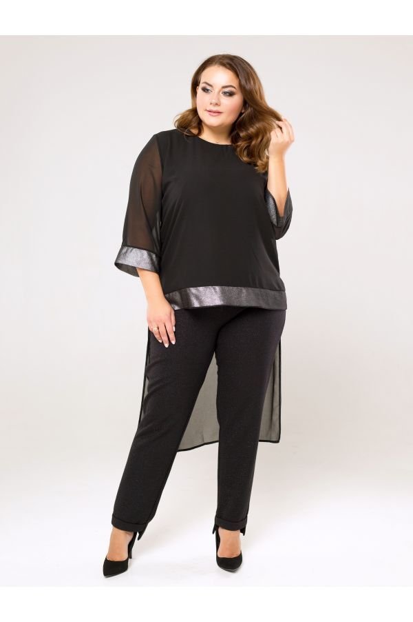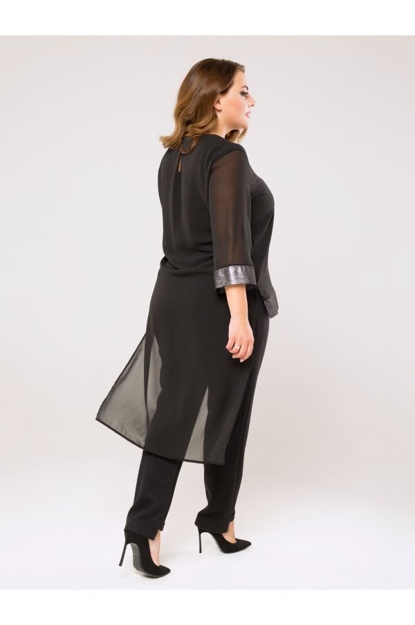 Элегантная блуза с удлиненной спинкой и разрезами по бокам. Украшают блузу серебристые вставки под сеткой. Застегивается по центру спинки на декоративные пуговки