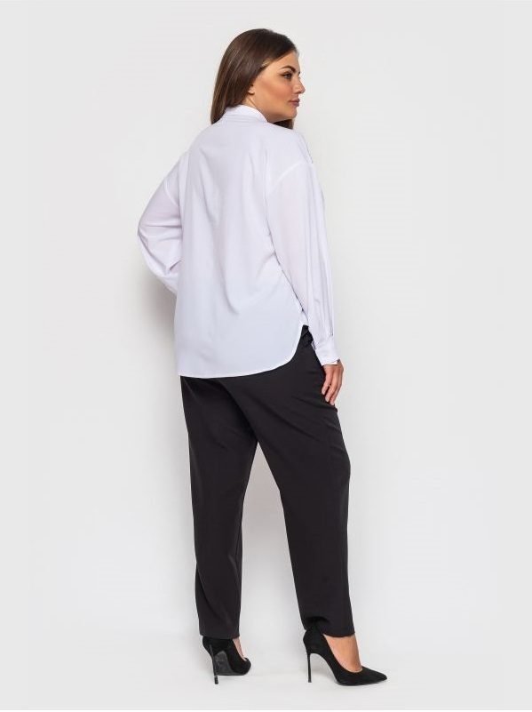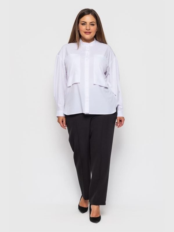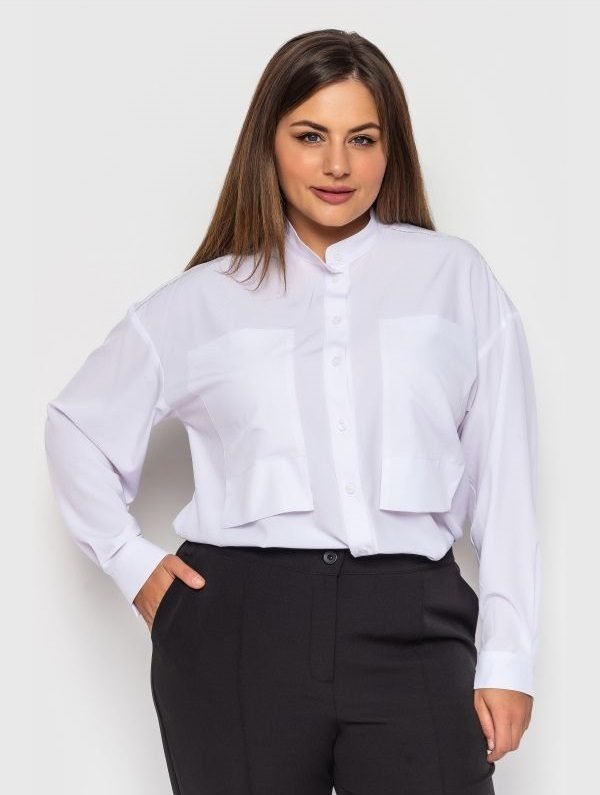 Классическая блуза свободного кроя с актуальными в этом сезоне накладными карманами. Воротник-стойка, блуза застегивается на пуговицы. Дополнена модель тесьмой "кучинелли" по плечам. Манжеты рукавов застегиваются на пуговицы. Спинка слегка удлинена, по бокам фигурные вырезы.