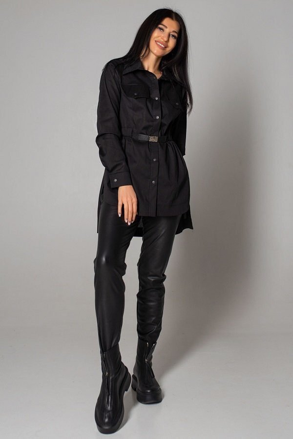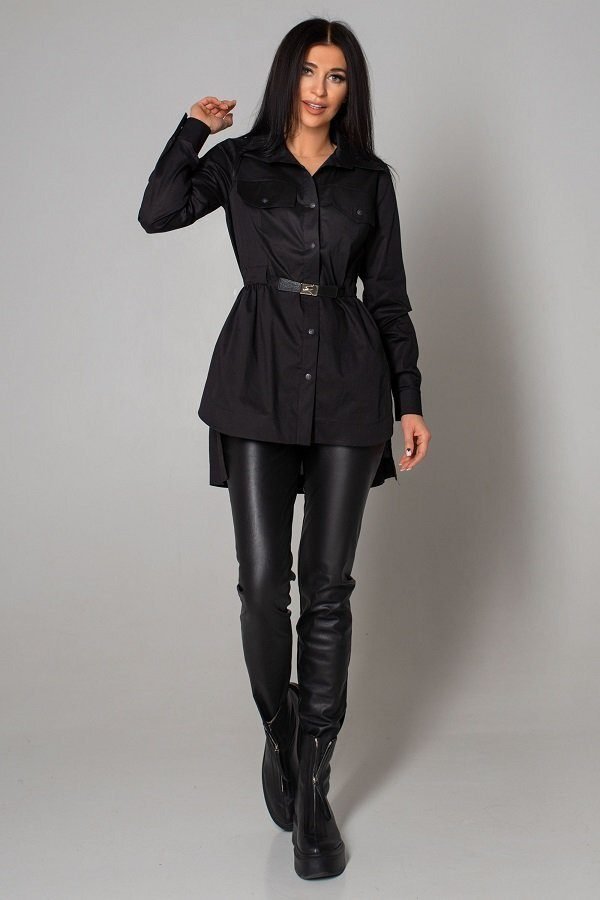 Безумно стильная удлиненная блуза не оставит не одну представительницу женского пола без внимания. Ведь такие модели уже давно стали главным элементом гардероба для создания оригинальных и стильных аутфитов. Изделие прямого кроя, с классическим английским воротником, длинным рукавом с манжетами и застежкой на кнопках, с декоративными клапанами на груди, - классика, которая станет палочкой-выручалочкой для Вашего повседневного лука. По талии (по спинке) - резинка, спереди рубашка застегивается на стильную пряжку, такой поясок визуально сделает Вашу талию тоньше, а силуэт стройнее. Модель с удлиненной спинкой и закругленным низом по полочке, с разрезами по бокам.