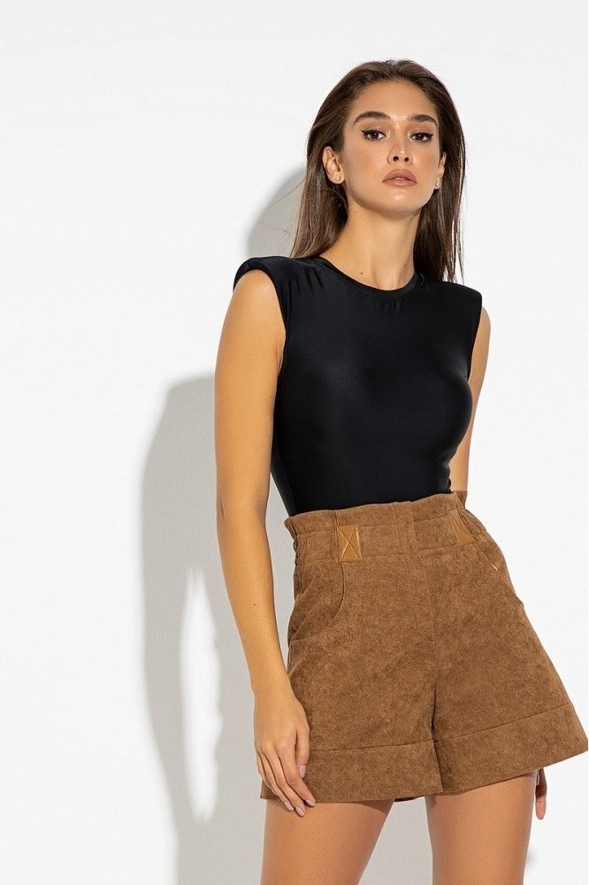 Стильное боди без рукавов с круглым вырезом, подплечниками и застежкой на крючки снизу. Отлично сочетается с базовой вещью в любом гардеробе. Замеры: длина свободном положении 58 см, в натянутом 71 см.
