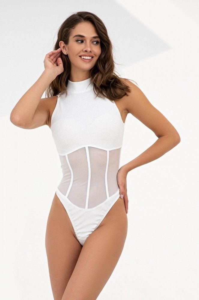 Боди-корсет из приятного к телу трикотажа в рубчик с силуэтными вставками из сетки. Модель максимально приталенного кроя, горизонтальные вставки визуально делают фигуру более вытянутой. Воротник-стойка подчеркивает красоту женской шеи. Застегивается на крючки. Боди-корсет идеальный вариант для создания сексуального образа.