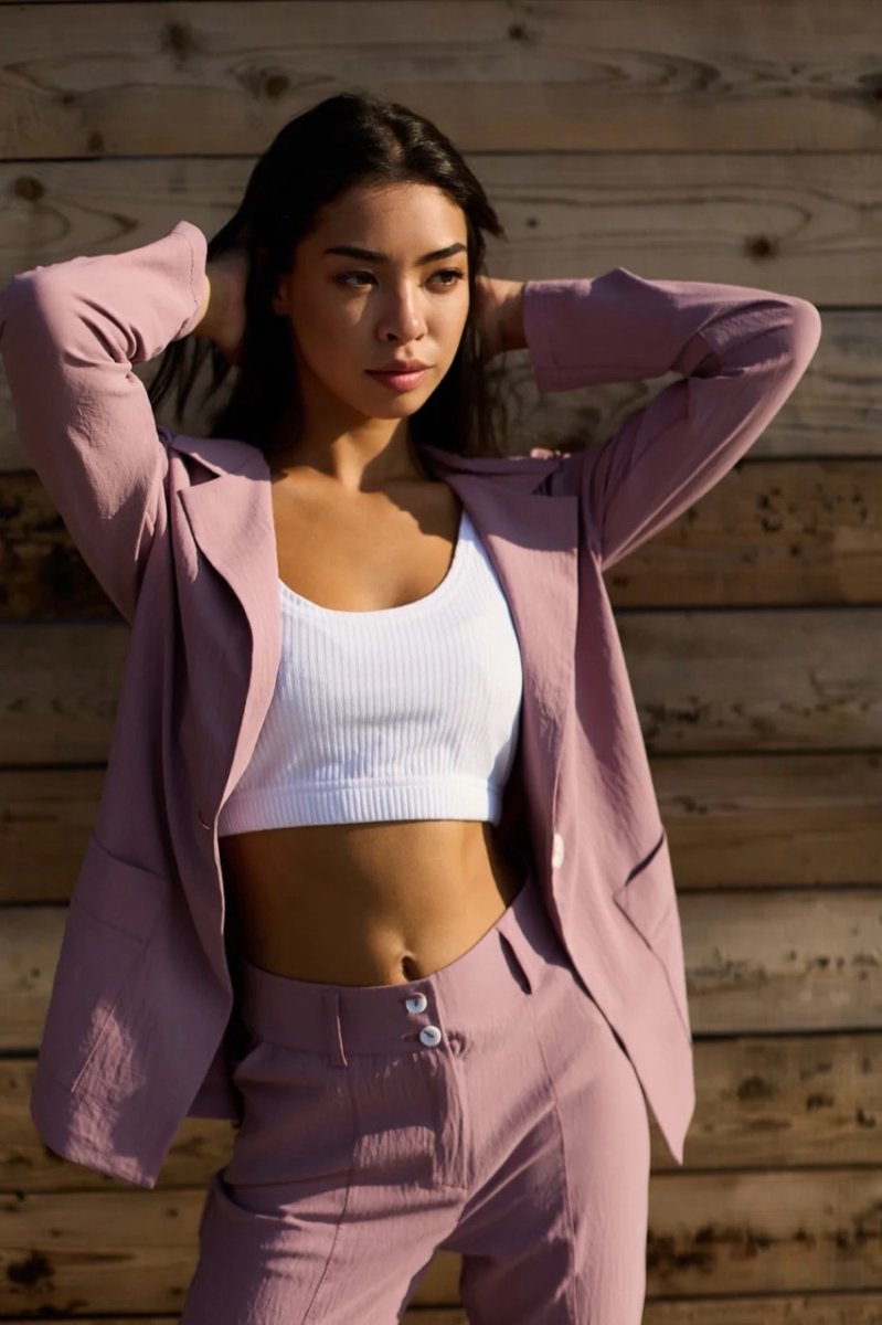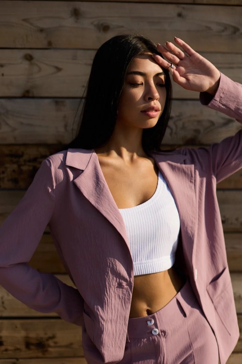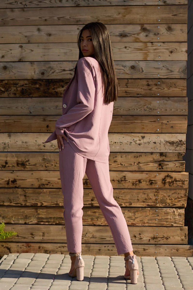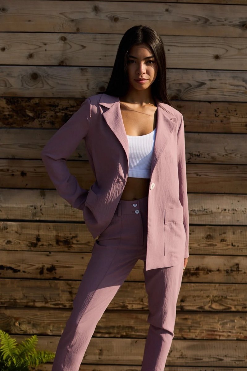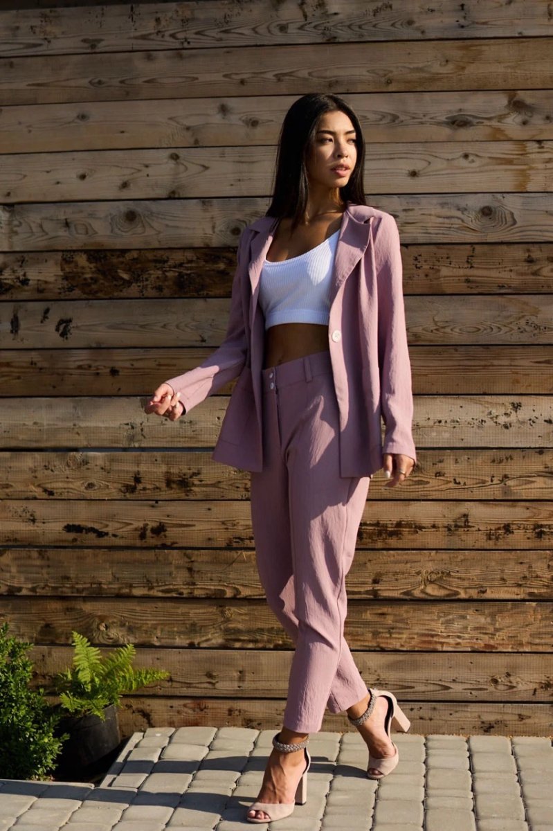 Брючный костюм лаконичного кроя идеальное решение для обновления гардероба. Нежный цвет легко комбинируется с топом, майкой или рубашкой. Брюки с высокой посадкой. На пиджаке есть накладные карманы.