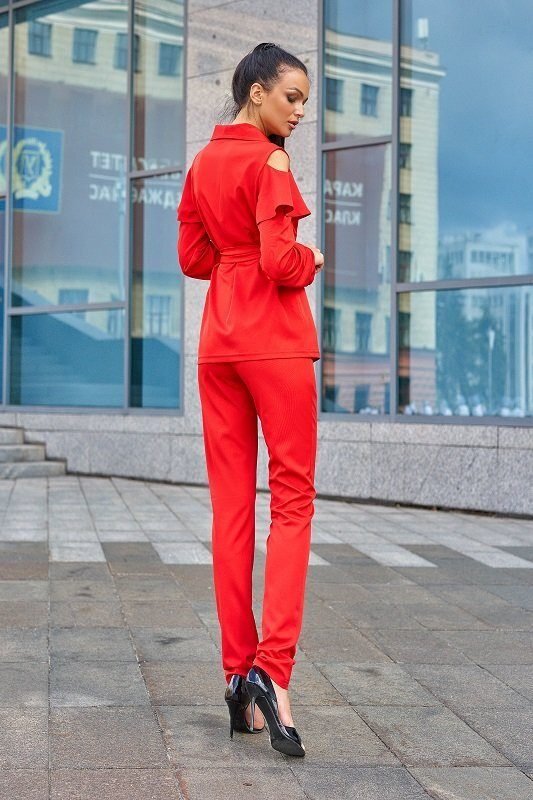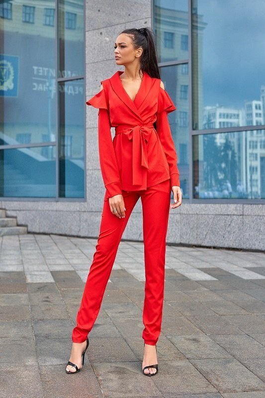 Элегантный костюм с брюками. Жакет с открытыми плечами и воланом по краю придает женственности, застегивается на потайные пуговицы. Брюки прямого кроя, заужены к низу.