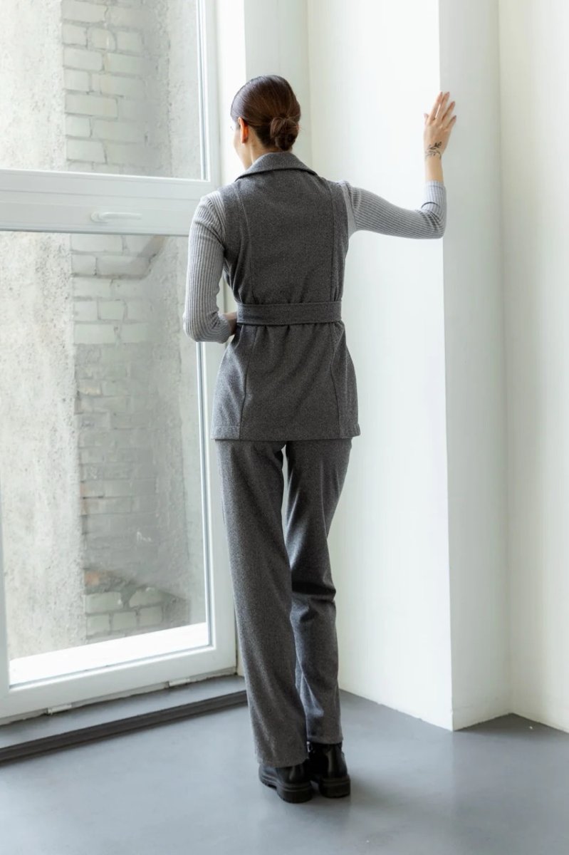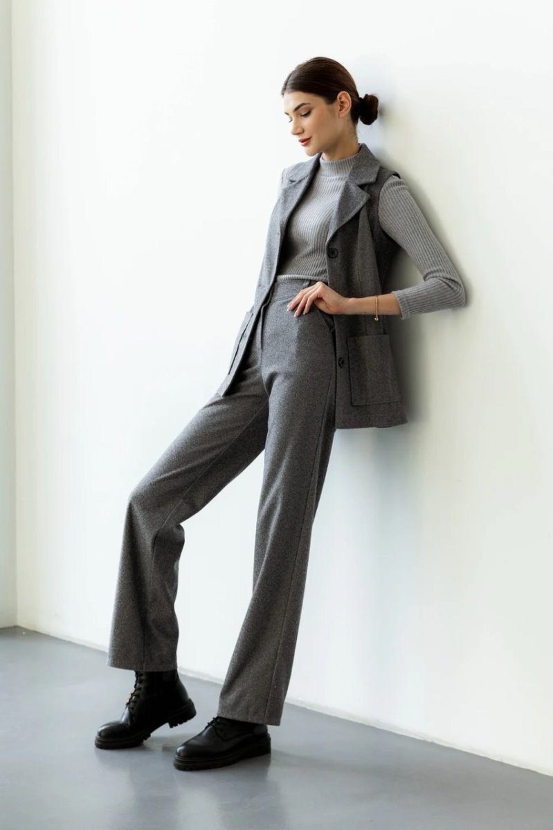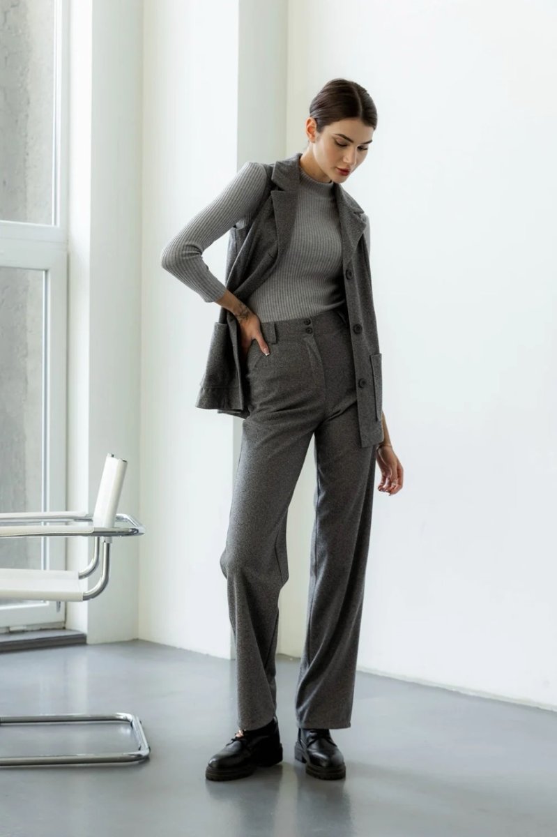 Серые брюки сделаны из высококачественной костюмной ткани. Их классический и прямой фасон делает их универсальными для демисезона, весны и осени. Брюки имеют удобную резинку на поясе и декоративные карманы сбоку. Фурнитура включает в себя молнию и пуговицы, что придает виду завершенности и стильности.