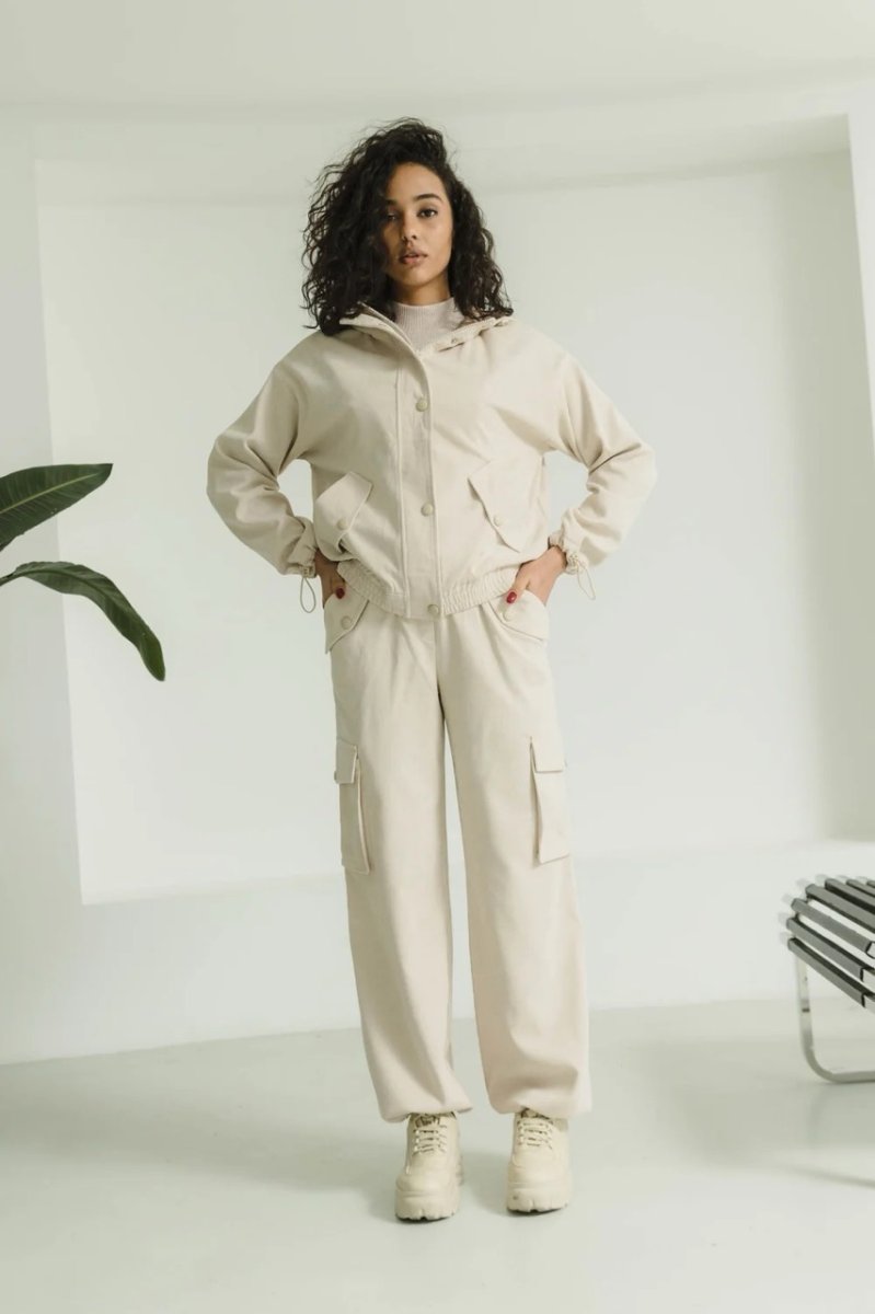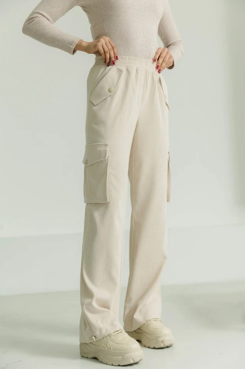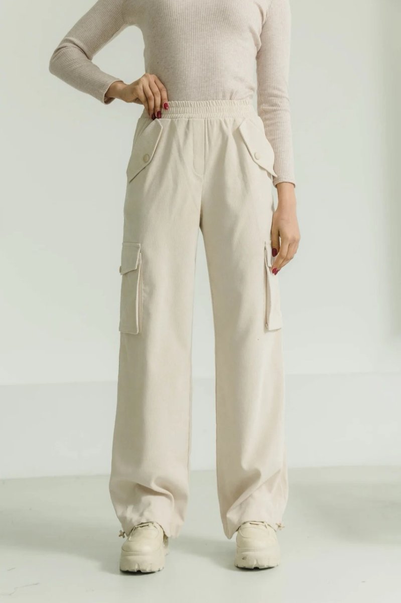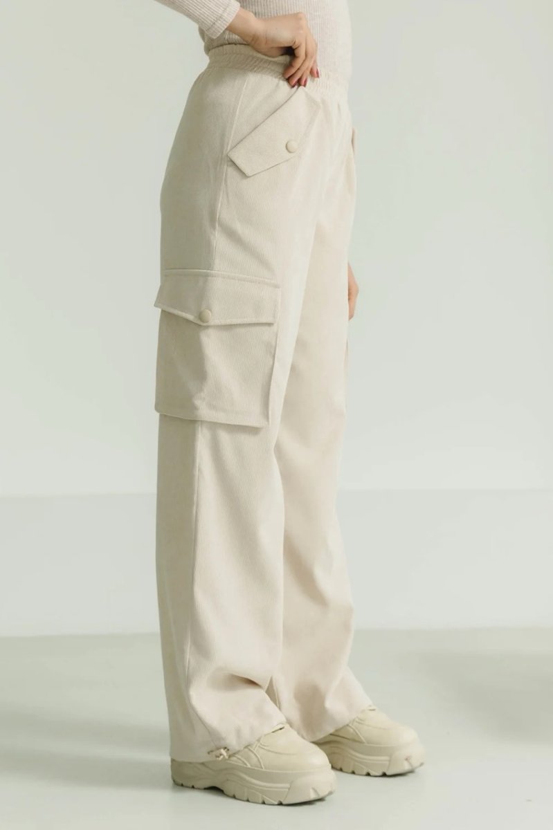 Декоративные элементы: накладные карманы, клапана, затяжка сбоку брюк