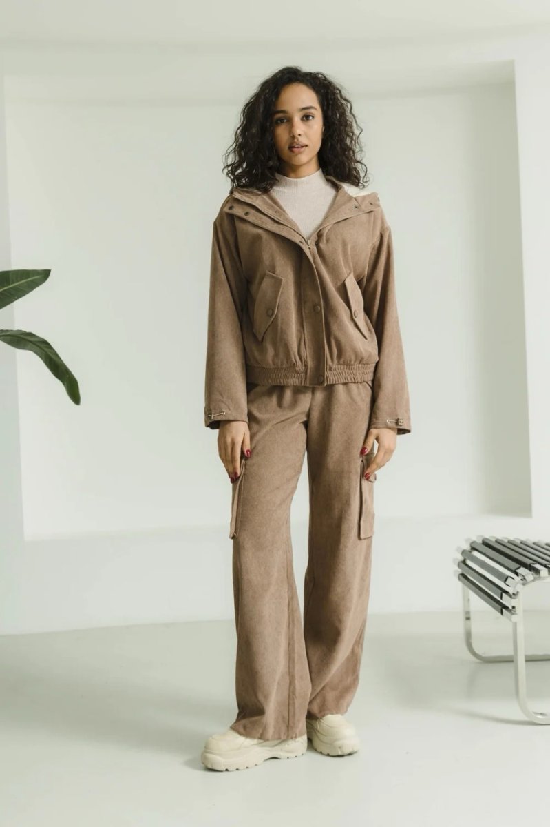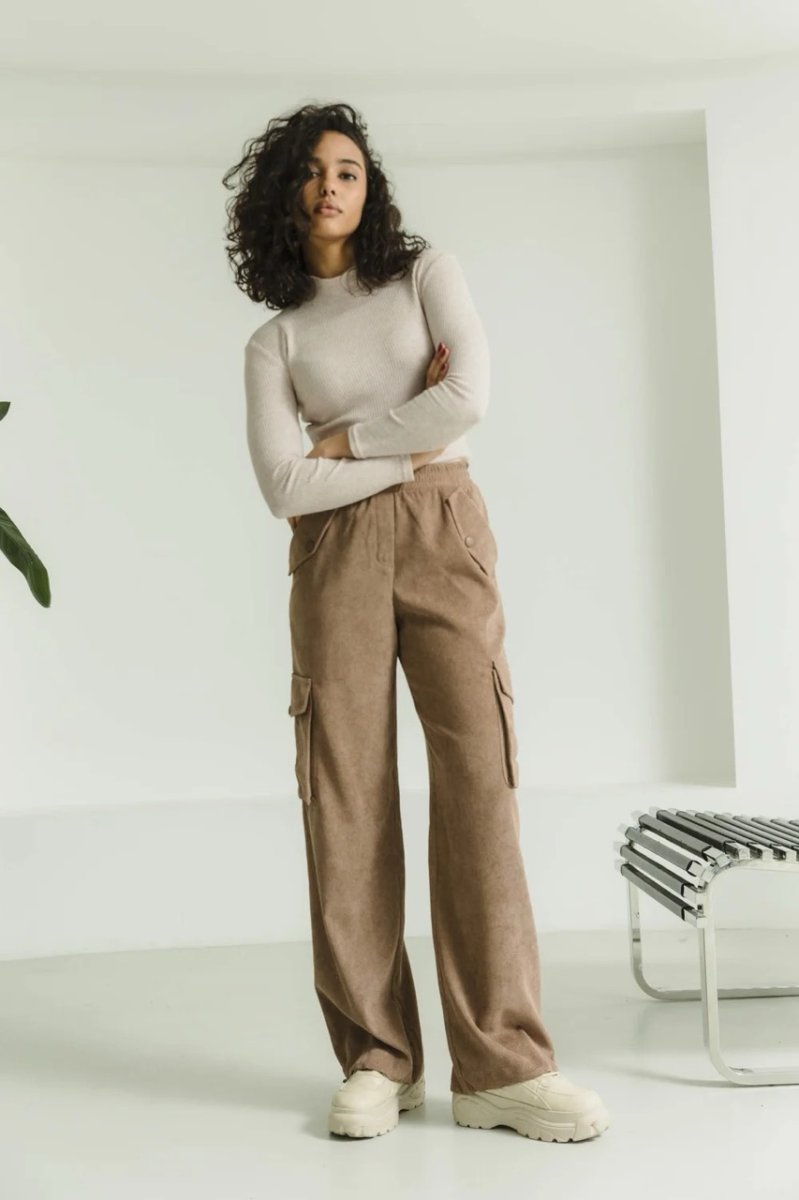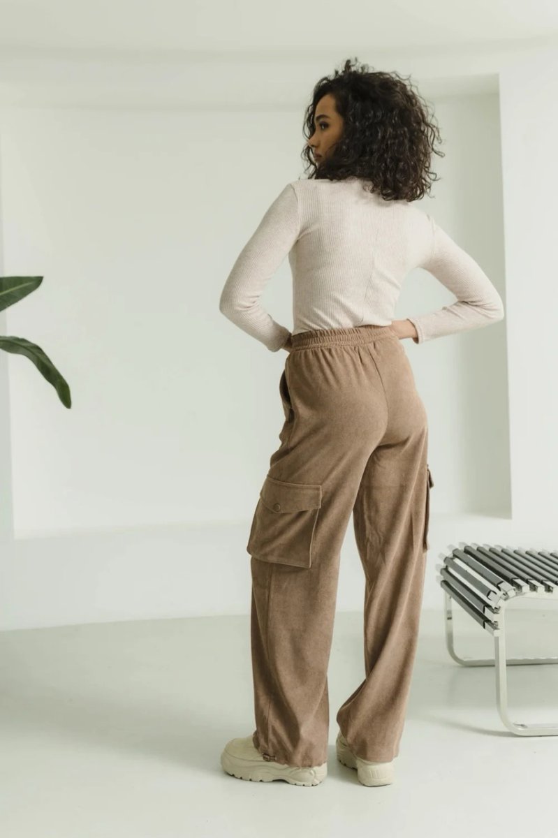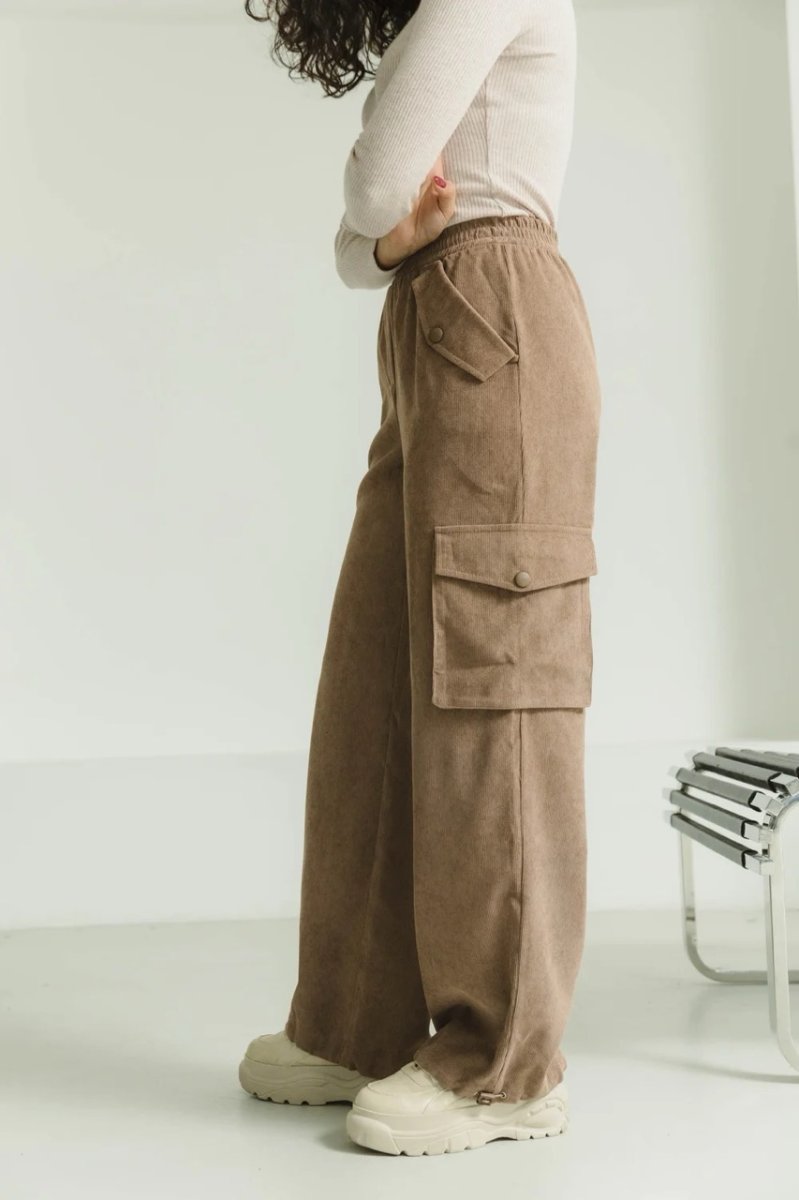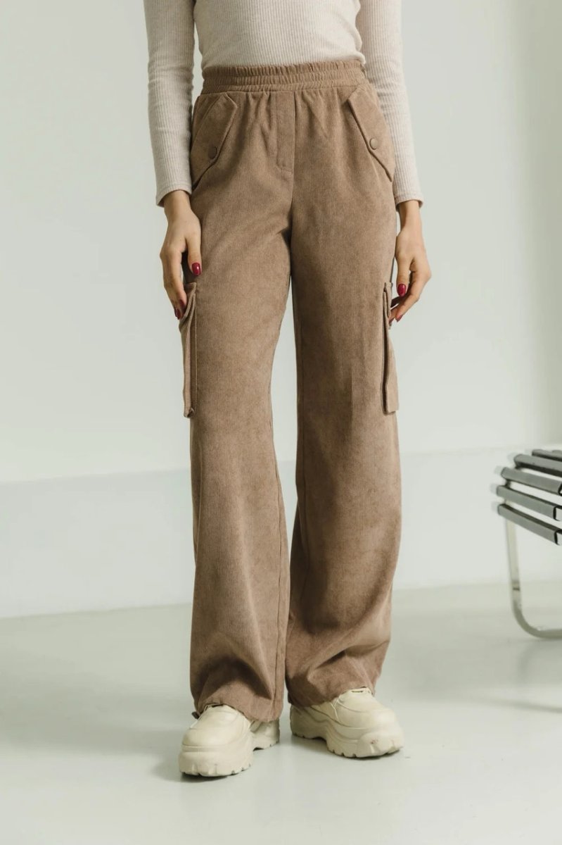 Декоративные элементы: накладные карманы, клапана, затяжка сбоку брюк