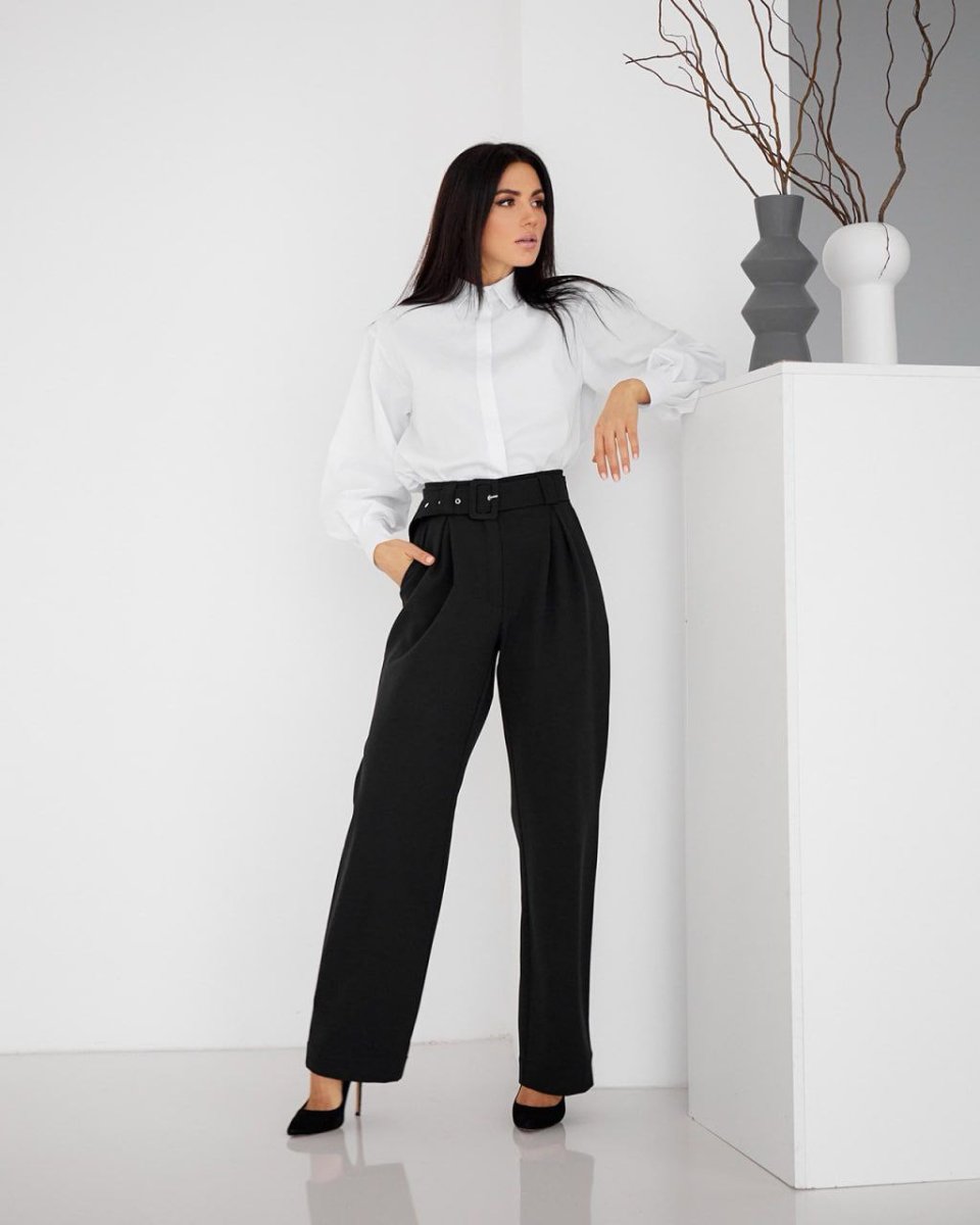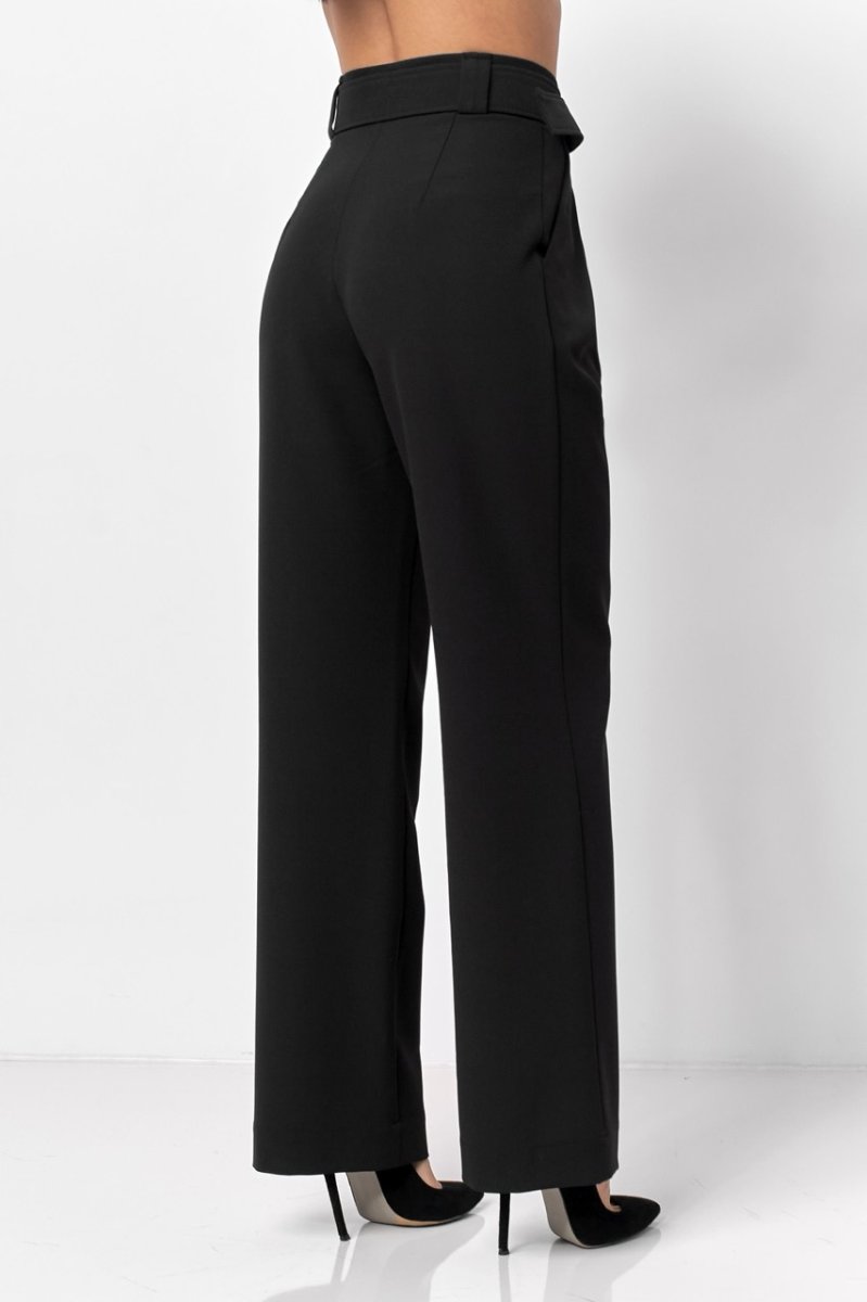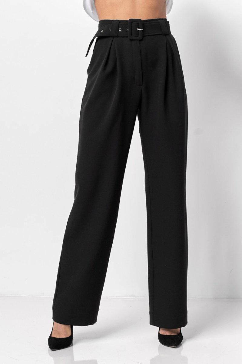 Брюки длинные, силуэт свободный. Передние половинки выполнены с встречными складками и карманами с отрезным бочком. На талии пояс с шлевками. Застежка гульфик с потайной молнией. Задние половинки с выточками. Низ брюк обработан швом в подгиб с закрытым срезом.