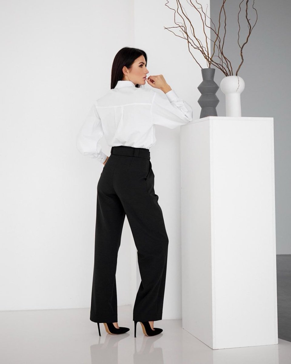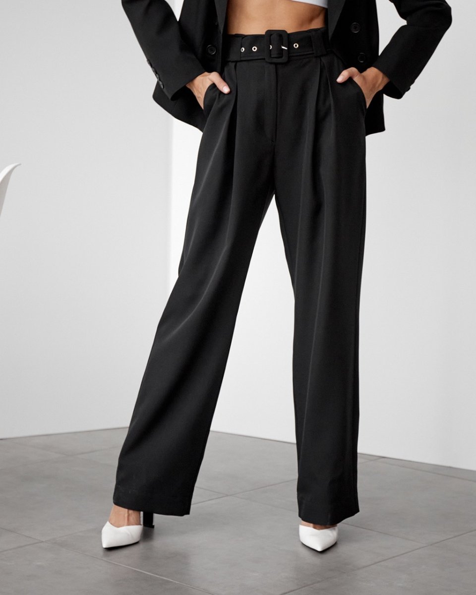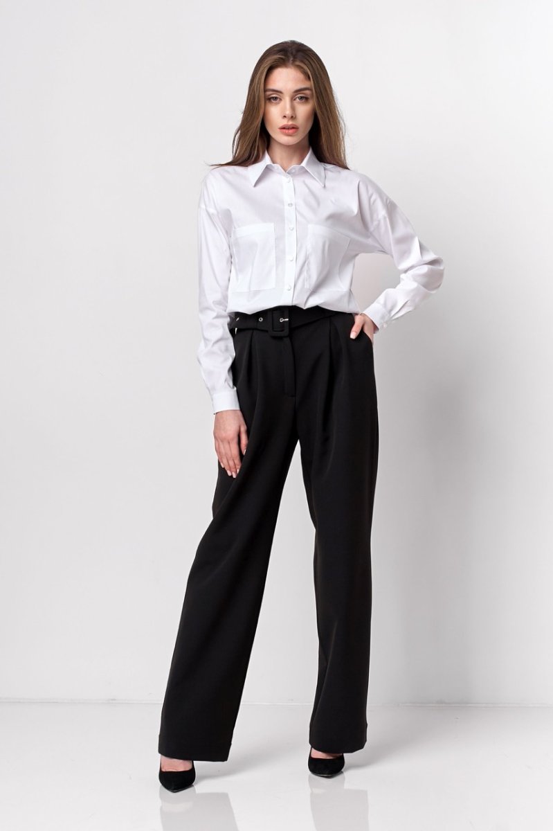 Брюки длинные, силуэт свободный. Передние половинки выполнены с встречными складками и карманами с отрезным бочком. На талии пояс с шлевками. Застежка гульфик с потайной молнией. Задние половинки с выточками. Низ брюк обработан швом в подгиб с закрытым срезом.