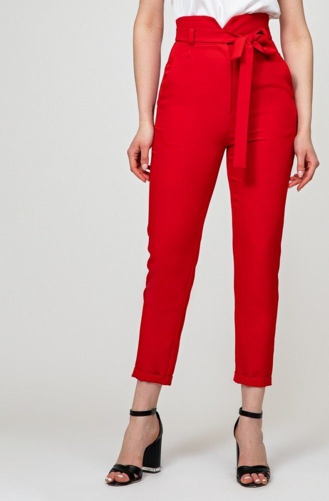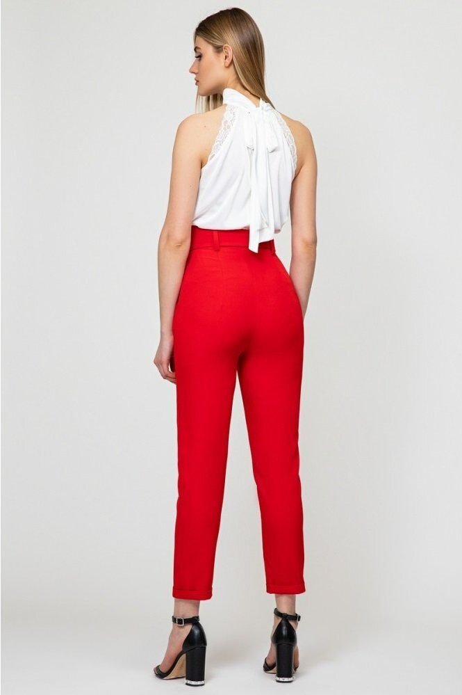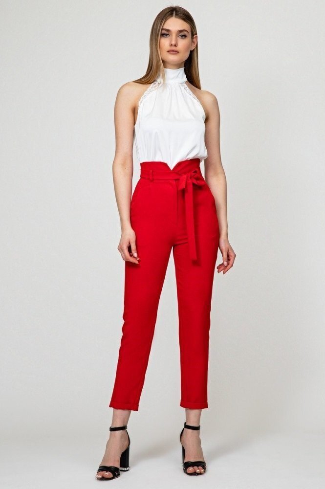 Брюки с высокой талией и боковыми карманами. Застегиваются спереди на молнию и пуговицу, комплектуются поясом.