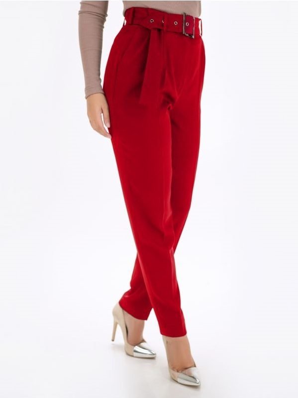 Классические брюки-бананы со стрелками, зауженные книзу. По бокам косые карманы. В комплекте пояс в тон изделия с пряжкой. Застегиваются на пуговицу и молнию.