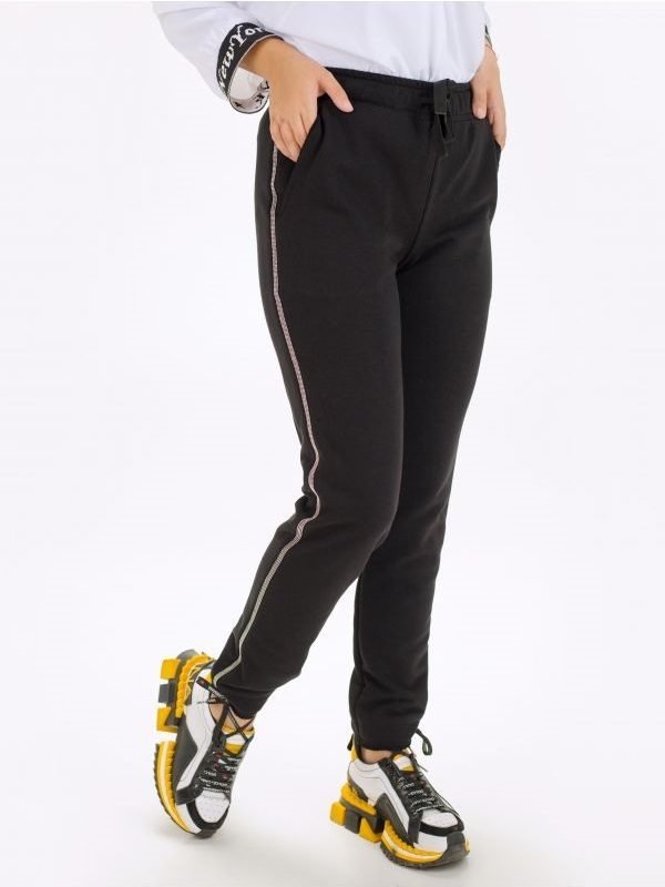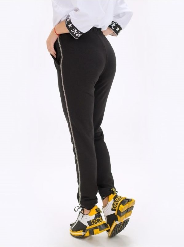 Комфортные, стильные брюки-джоггеры. Широкий, эластичный притачной пояс на завязках. По бокам лампасы из декоративной тесьмы. Боковые, косые карманы. Необработанные края манжет.