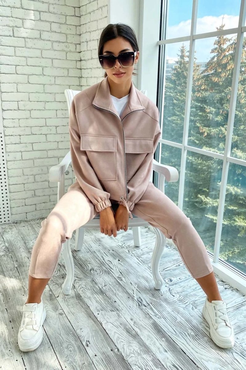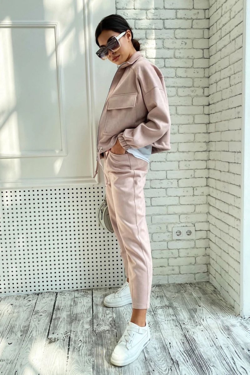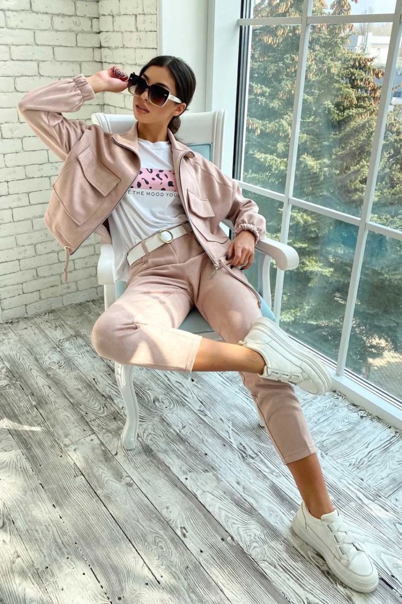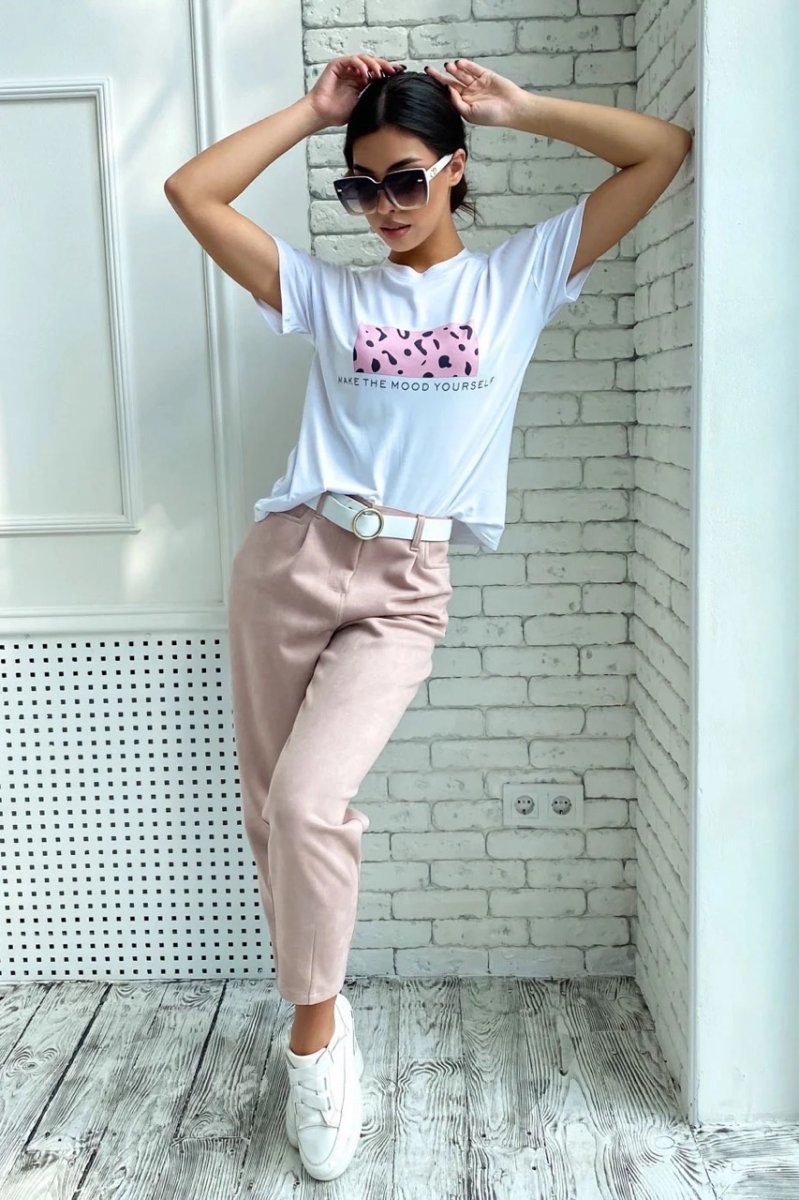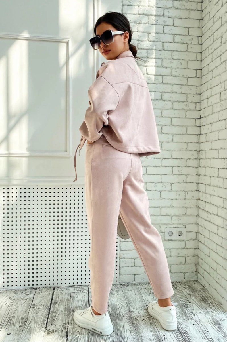 Широкие штаны с высокой посадкой. Материал – замша на дайвинге. Фасон свободный, широкий. Вытачки внизу брюк, карман с отрезным бочком.