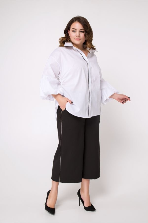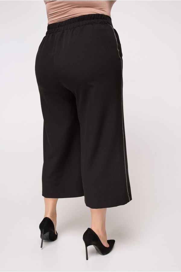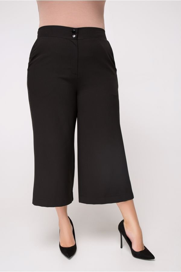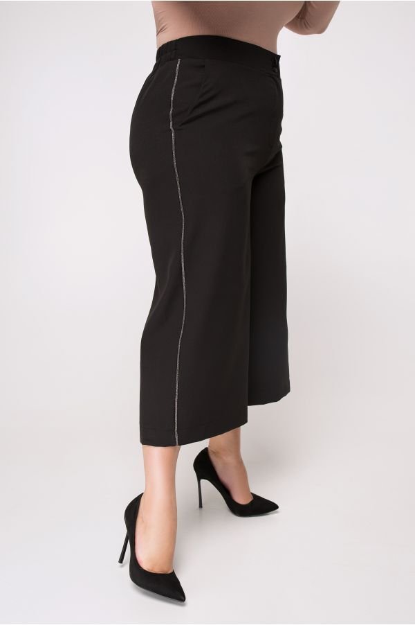Женские брюки-кюлоты высокой посадки, по спинке проходит резинка. Застегиваются на пуговицы и молнию. На брючинах тонкие лампасы из мелких страз. По бокам косые карманы.