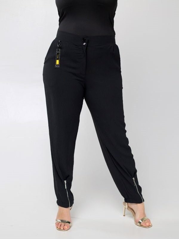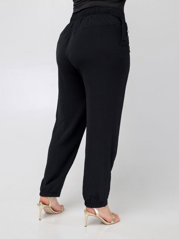 Летние брюки комфортного кроя высокой посадки. Застегиваются на пуговицу и молнию. Притачной пояс дополнен резинкой по спинке. Косые карманы по бокам. Манжеты брюк с эластичными вставками. В качестве декора использован съемный декоративный элемент.
