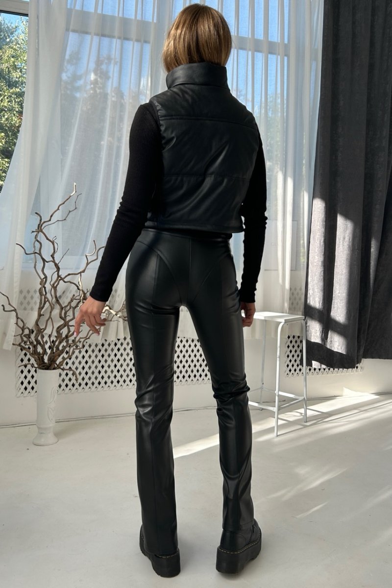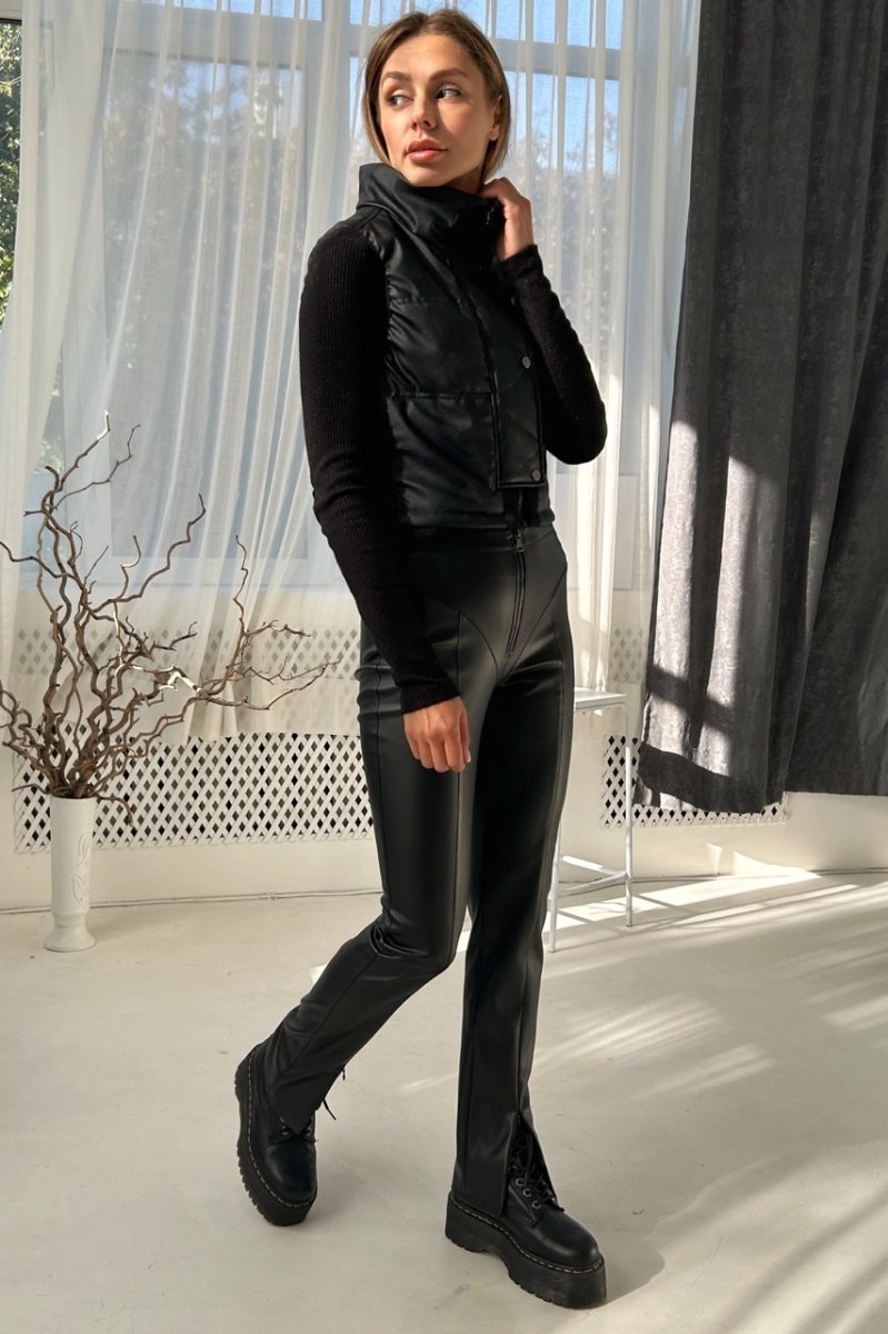 Эти брюки из эко-кожи на замшевой основе имеют модный дизайн с имитацией нижнего белья. Покрой брюк подчеркивает естественную красоту женской фигуры.