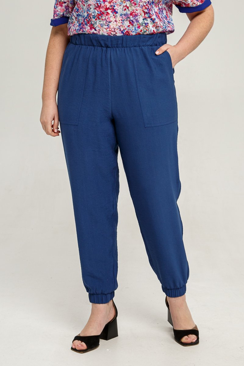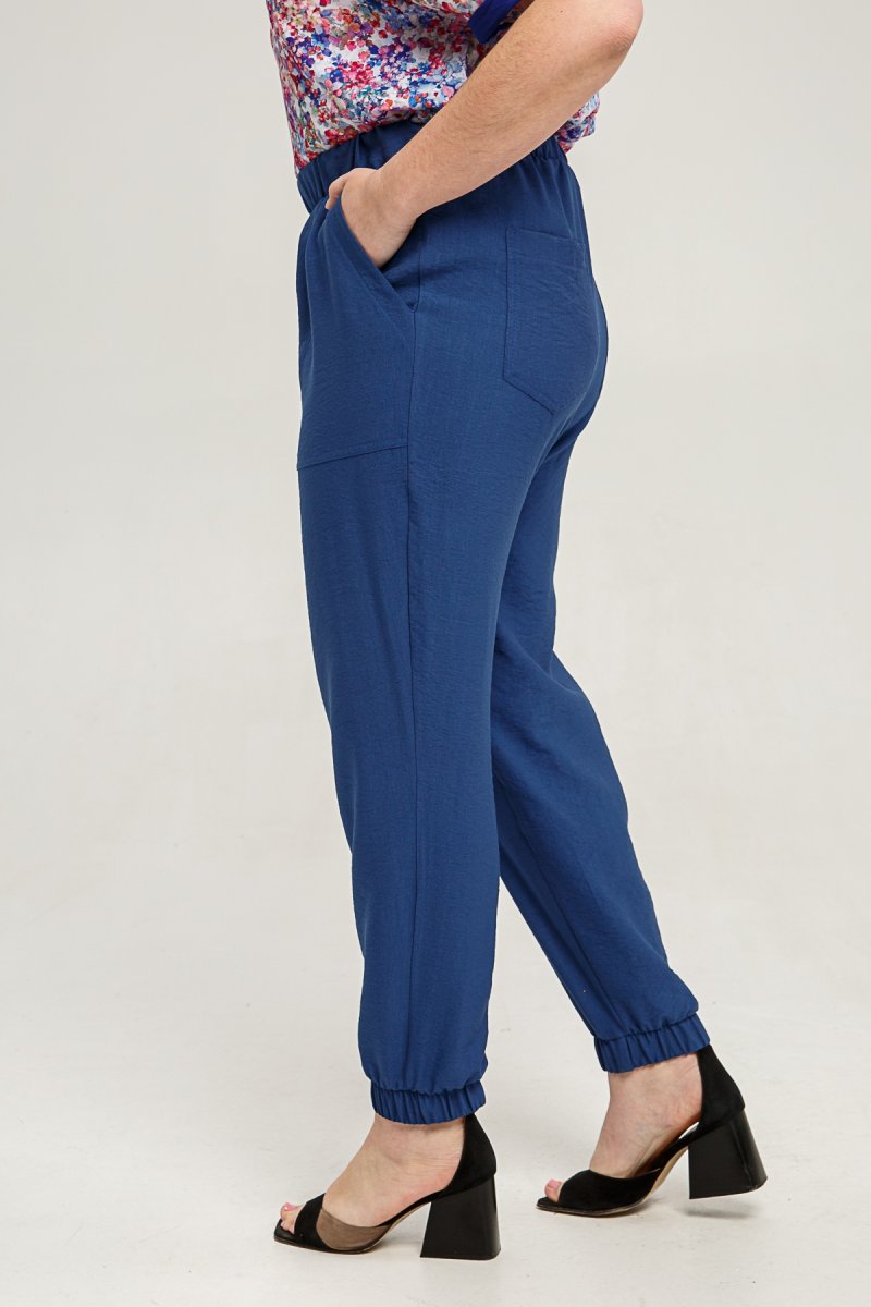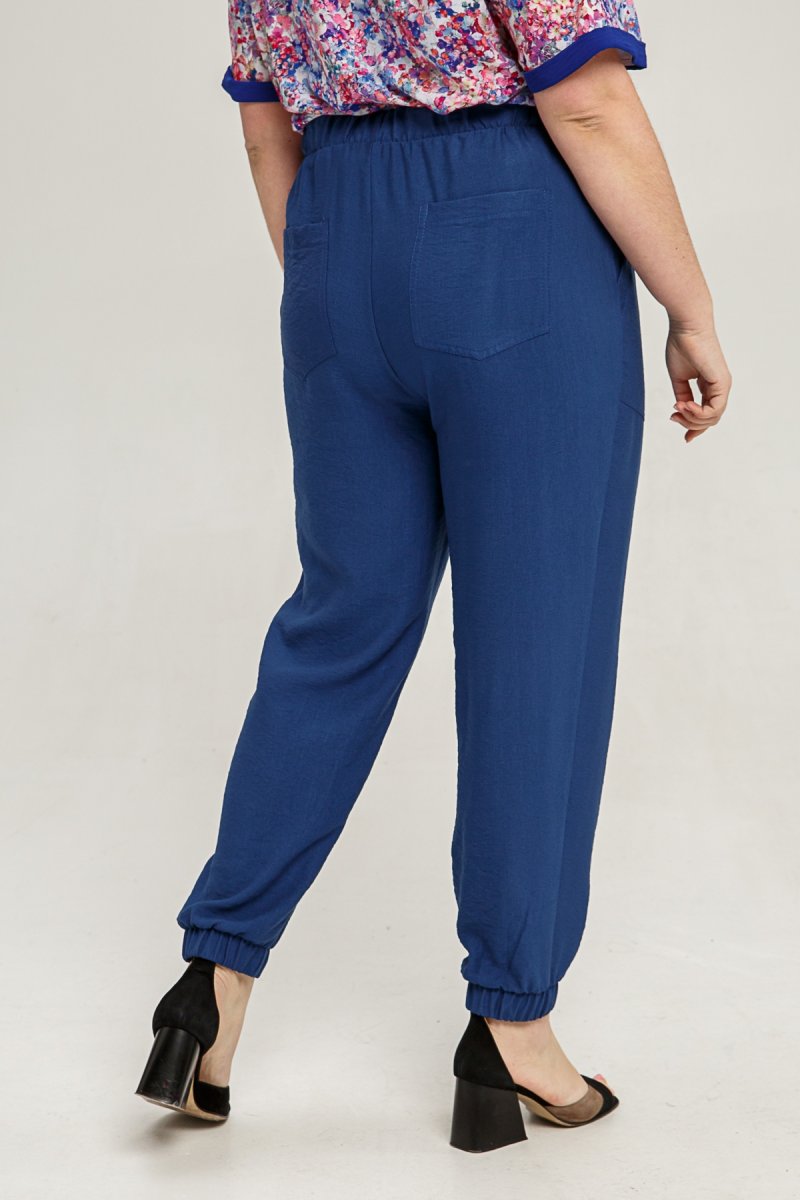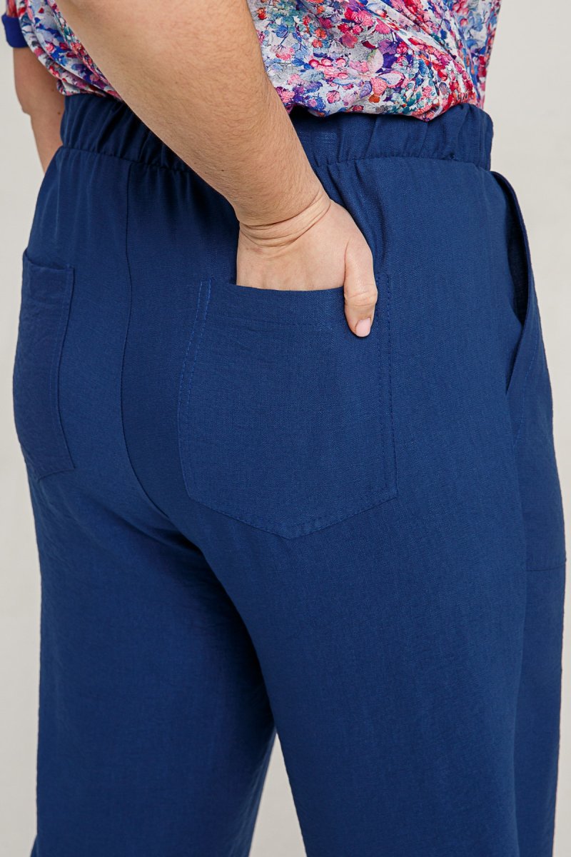 Брюки прямые снизу на манжете с резинкой. Выполнены из жатого льна. Ткань слегка сжатая, более мягкая и тоньше стандартного льна, не дает усадку. По задней и передней части накладные карманы. В поясе расположена широкая резинка.