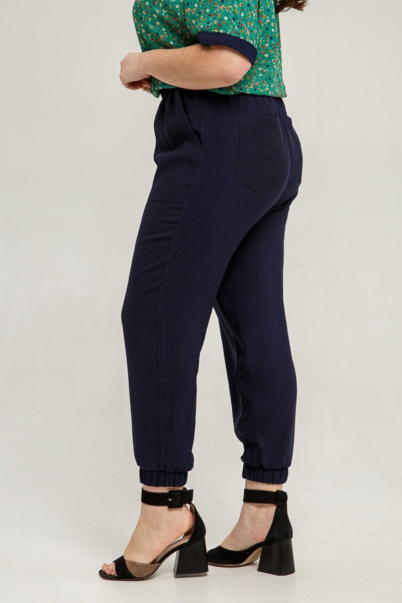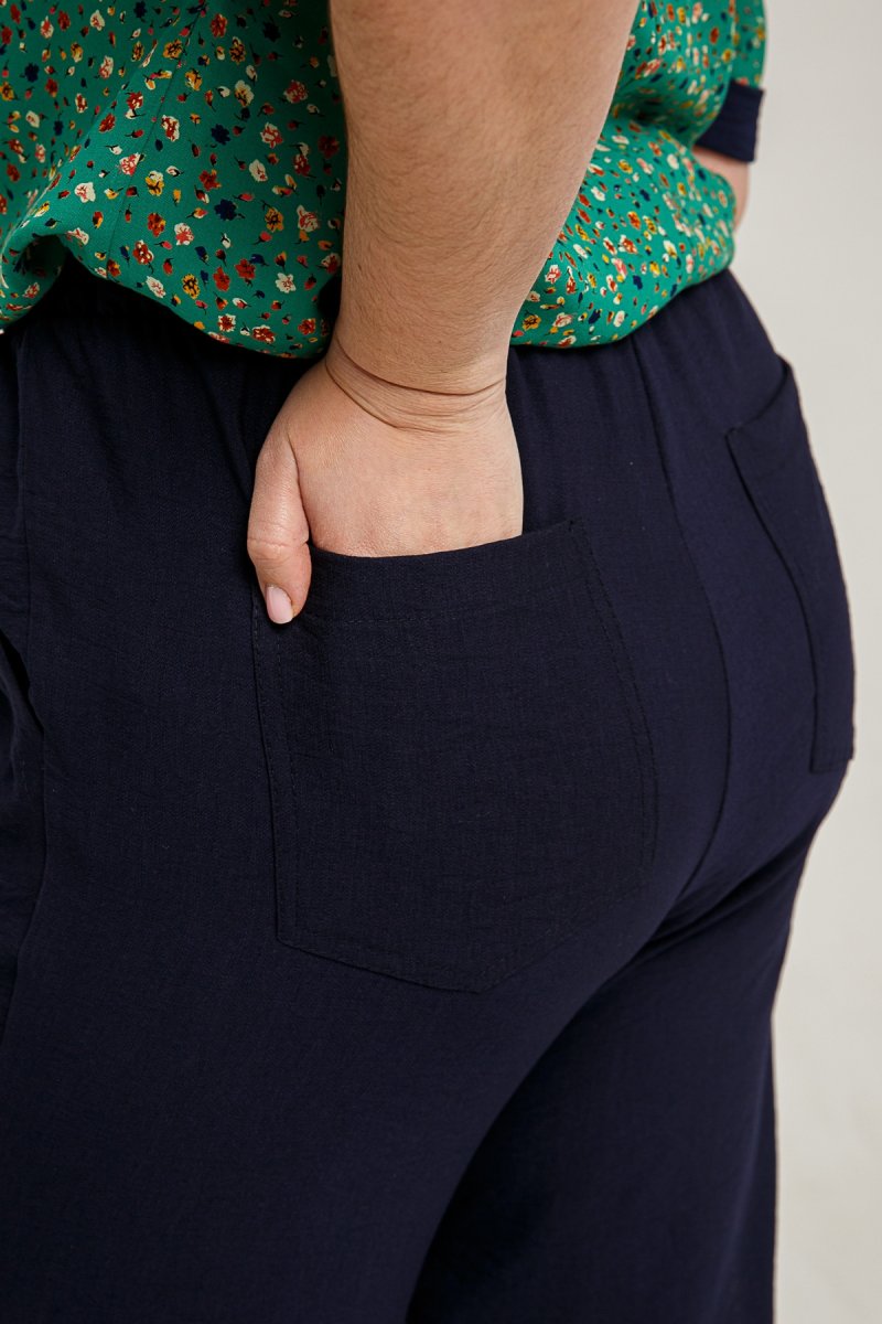 Брюки прямые снизу на манжете с резинкой. Выполнены из жатого льна. Ткань слегка сжатая, более мягкая и тоньше стандартного льна, не дает усадку. По задней и передней части накладные карманы. В поясе расположена широкая резинка.