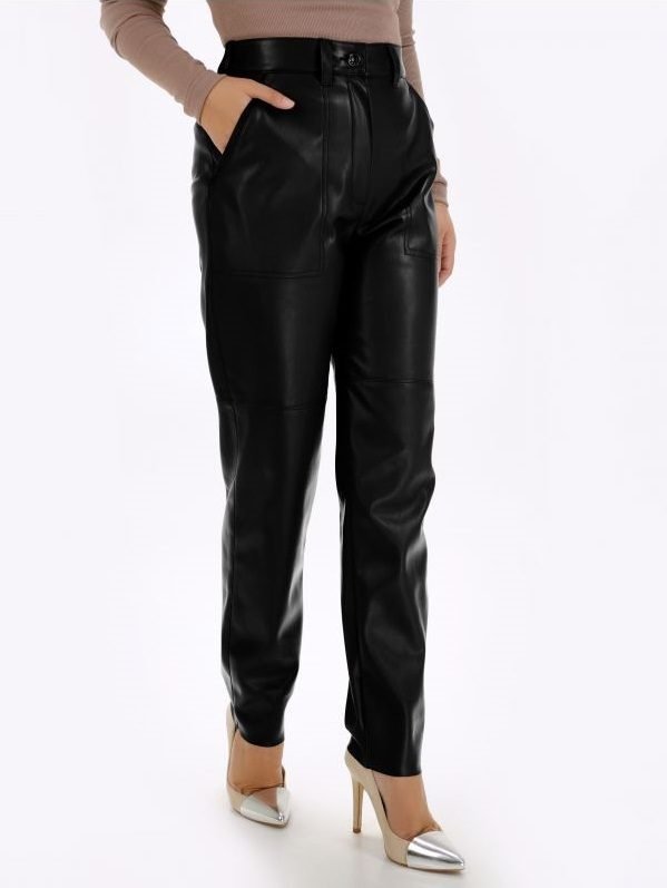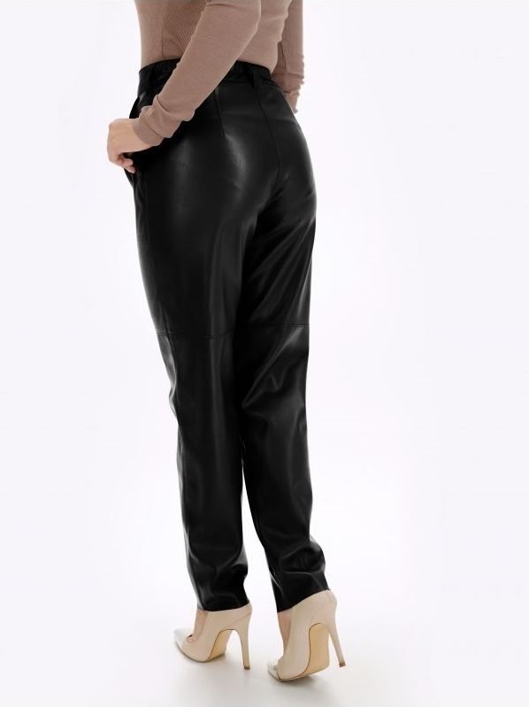 Стильные, элегантные брюки-бананы. Зауженный крой, высокая посадка. Притачной пояс застегивается на пуговицу и молнию, сзади - эластичная вставка. По поясу проходят шлевки для ремня. По бокам косые карманы, оформленные листочками. Необработанные края брюк.
