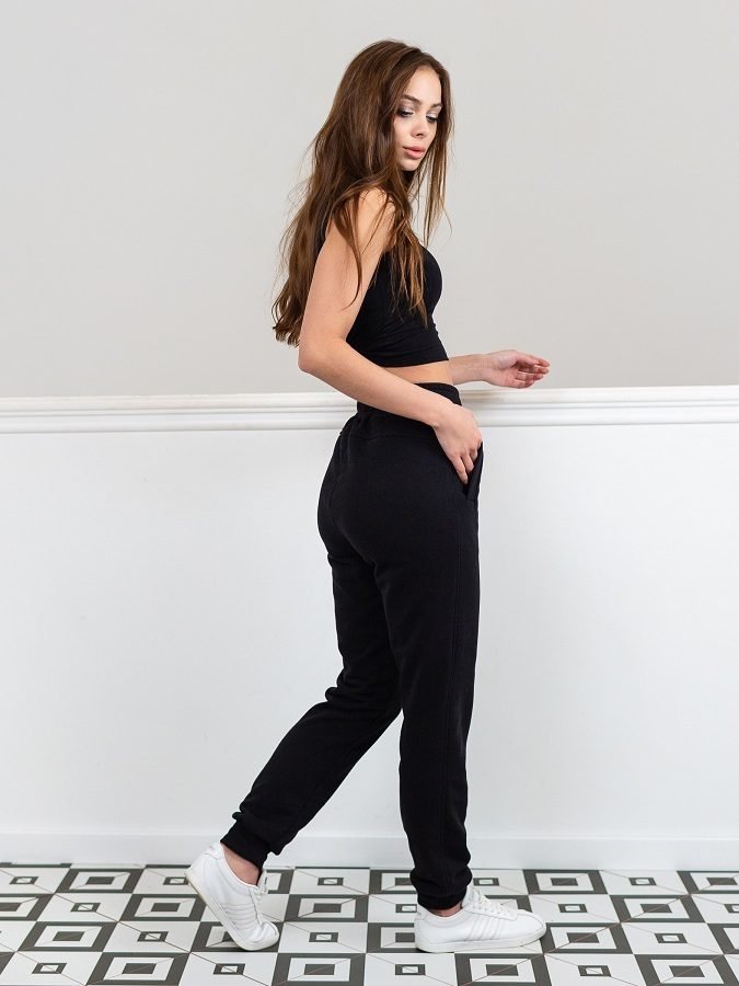 Традиционные брюки-джоггеры на широком эластичном поясе. По бокам карманы с листочками, внутри карманов подклада - сетка. В нижней части - манжеты.