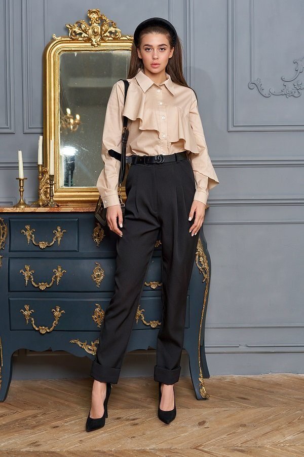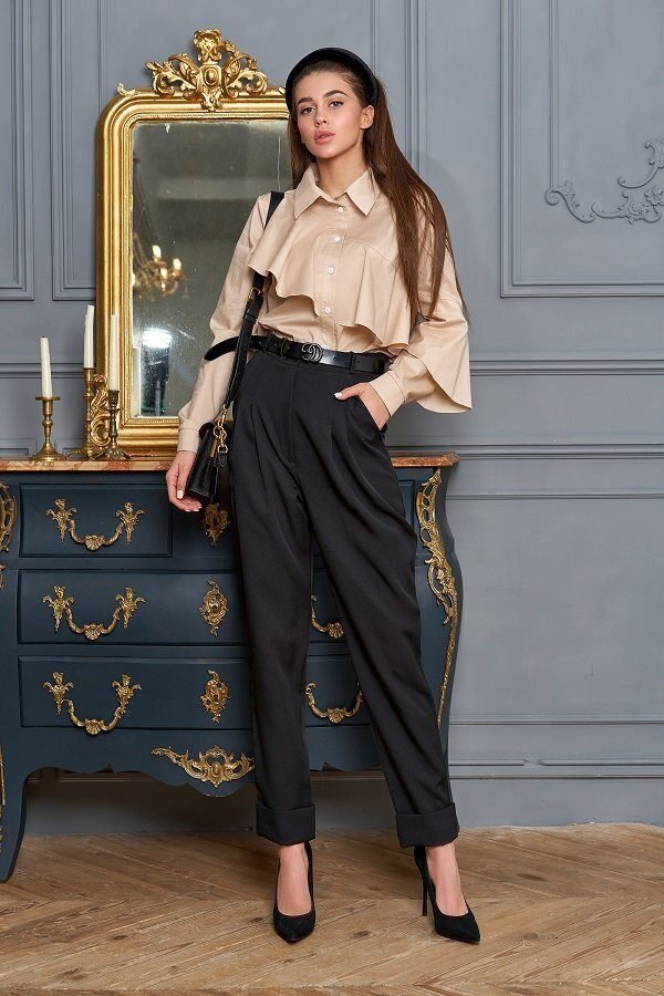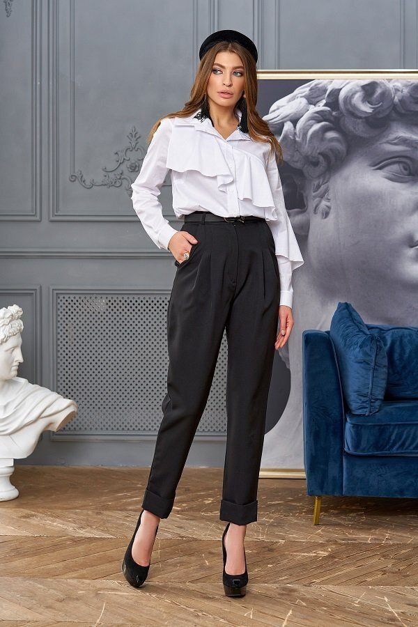 Модная новинка нашей коллекции - женские брюки фасона “бананы”, сверху весьма свободные, они сужаются к низу, но при этом не обтягивают икры. Классическая укороченная модель брюк с завышенной талией, и отворотами -  прекрасно впишеться в Ваш гардероб.  Важной деталью модели является пояс со шлевками и несколько крупных складок по поясу  - это позволяет добиться объема на бедрах. По бокам на брюках есть врезные карманы. Верх к этой модели лучше подбирать так, чтобы ее можно было заправить -  блуза, рубашка, топ или водолазка, - практически любой такой Look может быть завершен подходящим ремешком или поясом. В этой модели Вы будете комфортно себя чувствовать в ритме современного мегаполиса.