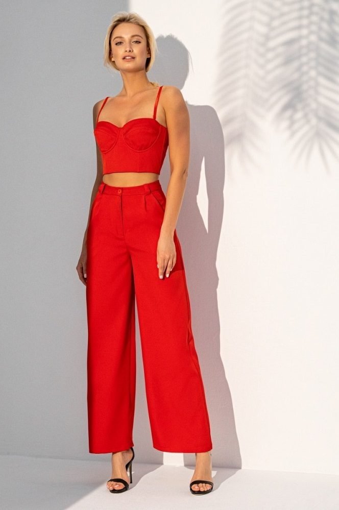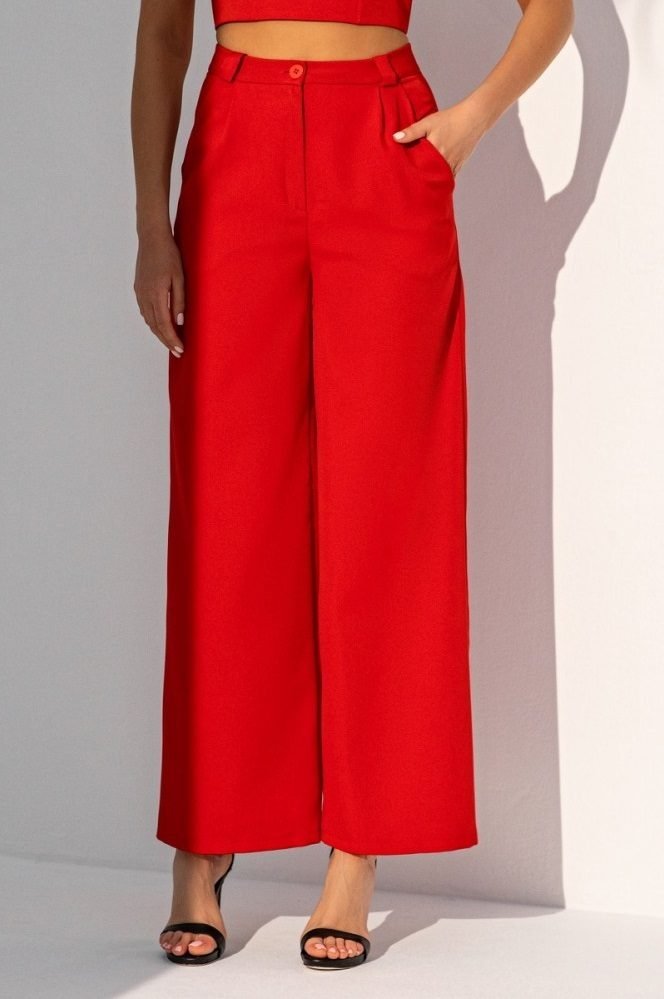 Широкие брюки-палаццо с завышенной талией и боковыми карманами из костюмной ткани. Застегиваются на молнию и пуговицу. Струящаяся до пола ткань придает образу утонченность, но при этом подчеркивает свободу и раскованность своей обладательницы.