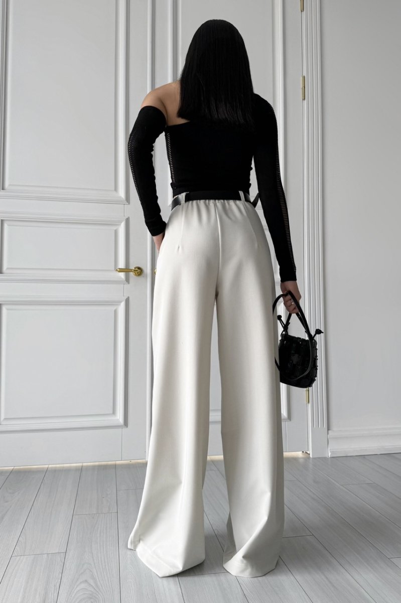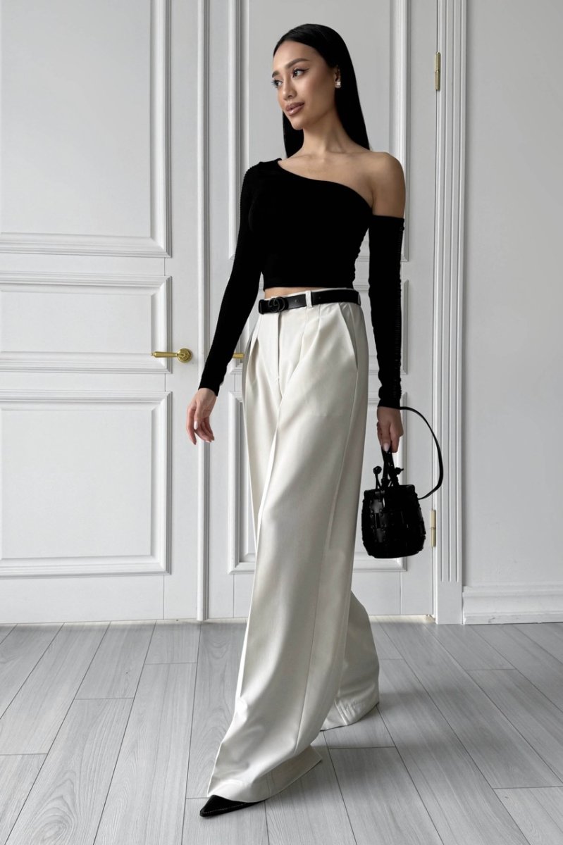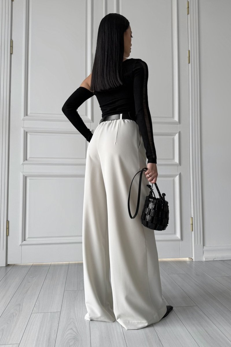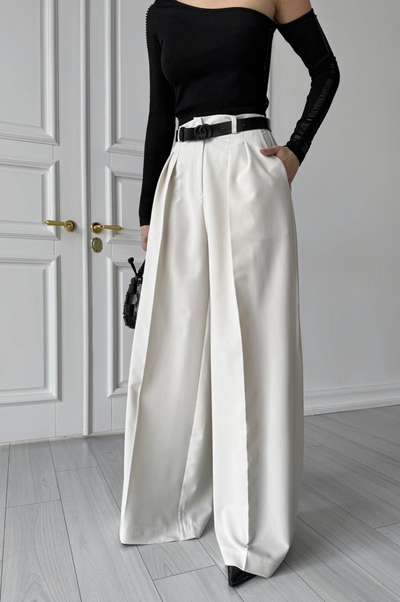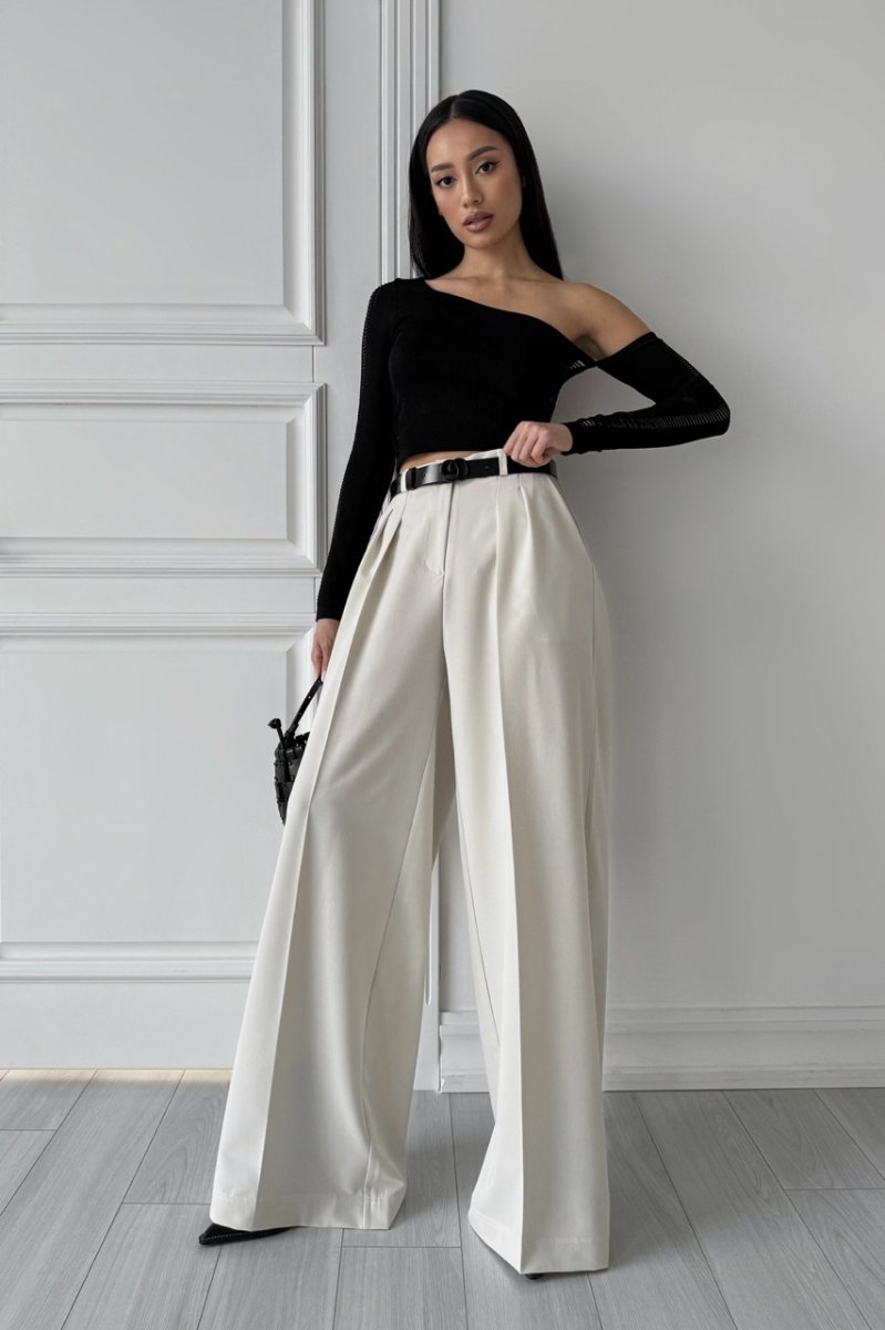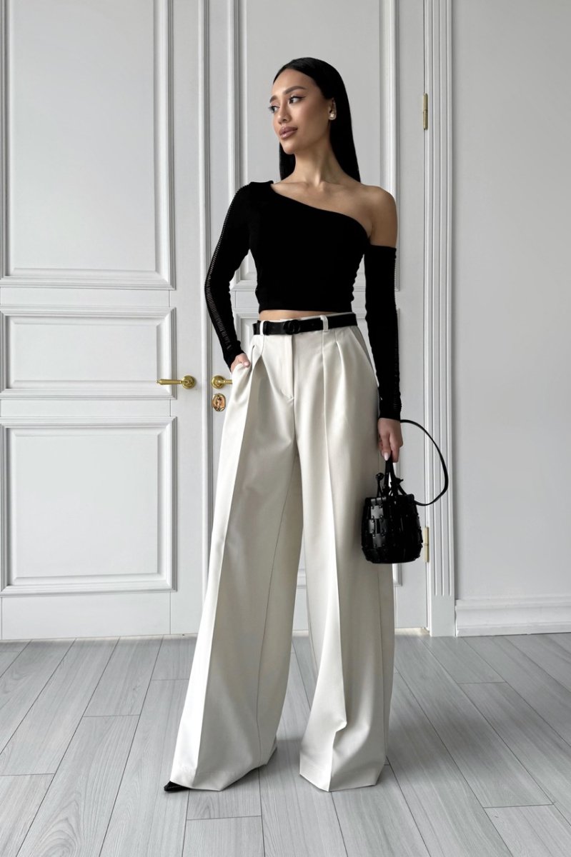 Брюки имеют широкий крой, среднюю посадку и карманы по бокам. Дизайн завершают стрелки спереди.