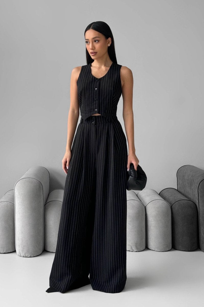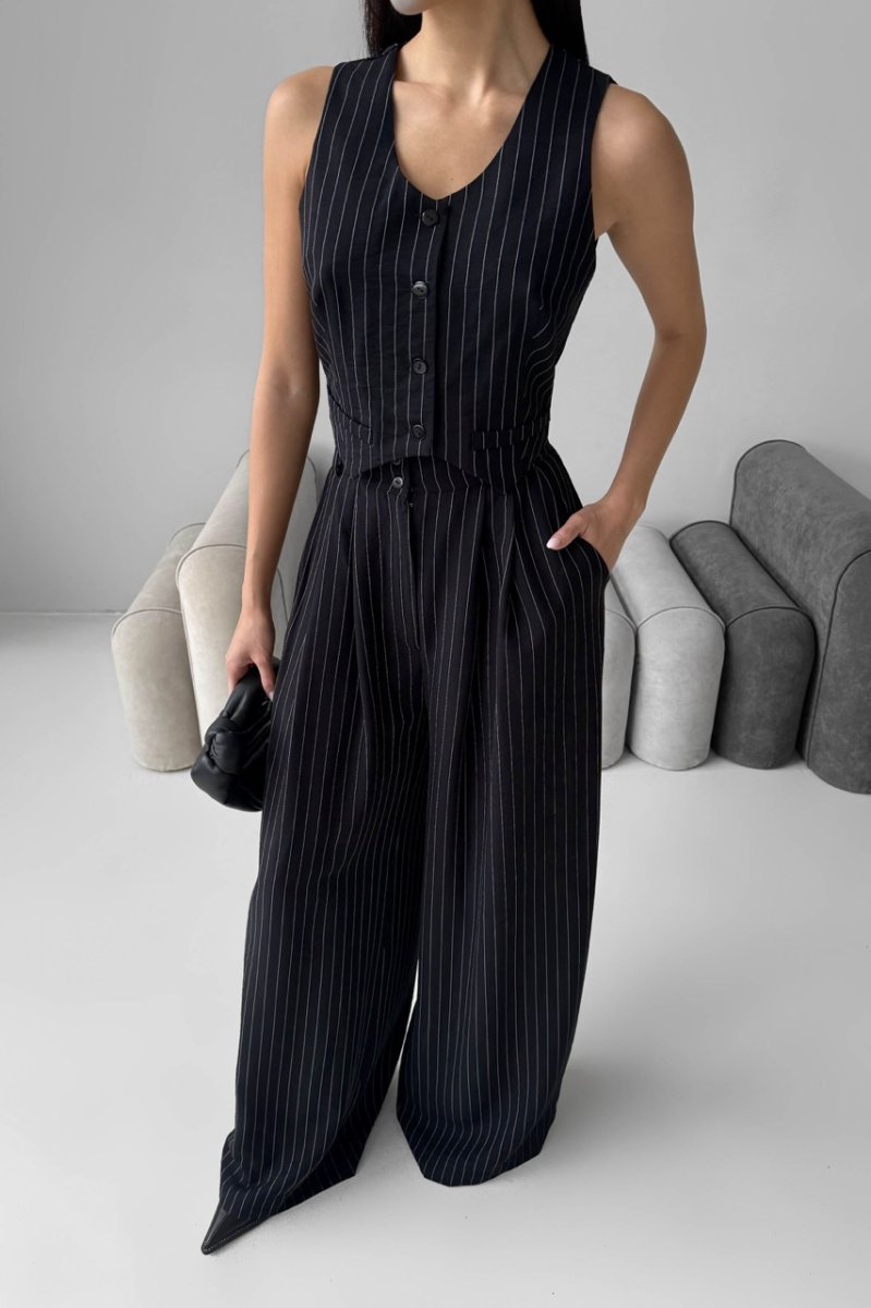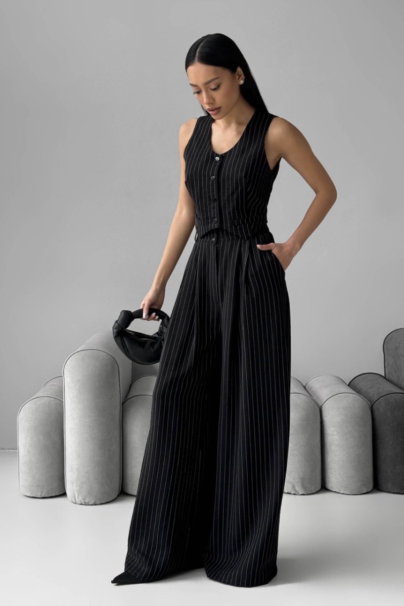 Классические брюки-палаццо прямого кроя, со складками по переду. Модель с комфортной посадкой станет базовым элементом для создания повседневного или делового образа. Модель дополнена удобными боковыми карманами. По спинке на талии – резинка, ширина шлевок – 6 см.