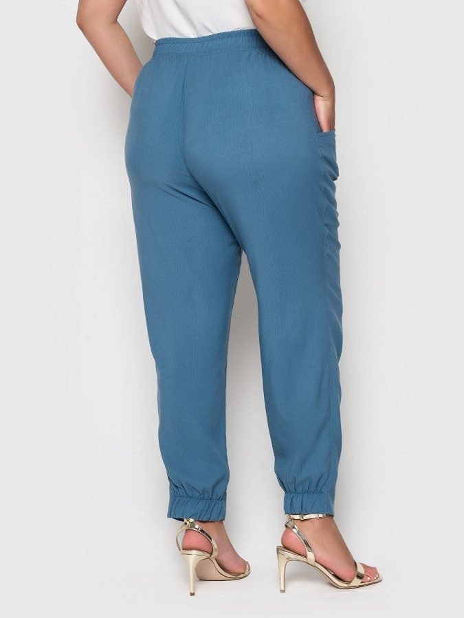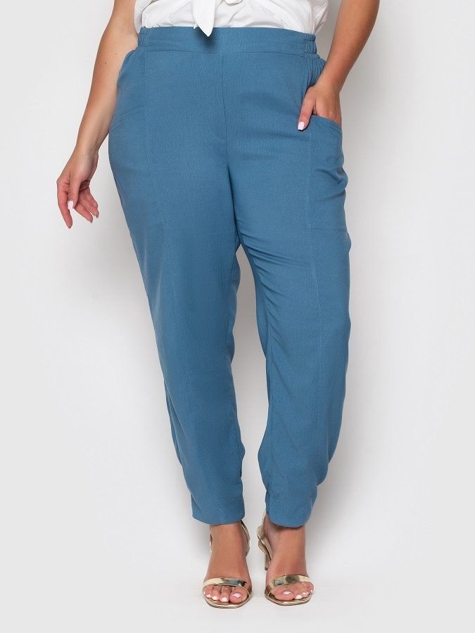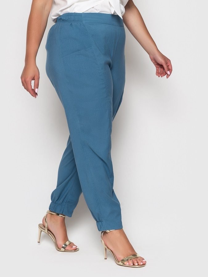 Легкие летние брюки высокой посадки зауженные книзу. По спинке пояса - эластичная вставка. Сзади манжет оформлен эластичной вставкой. Горизонтальные боковые карманы.