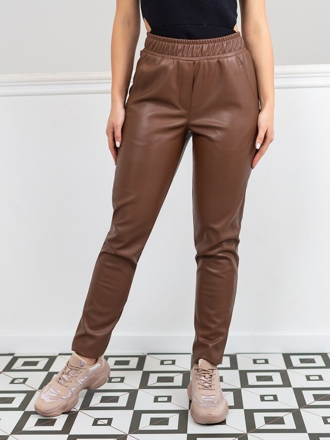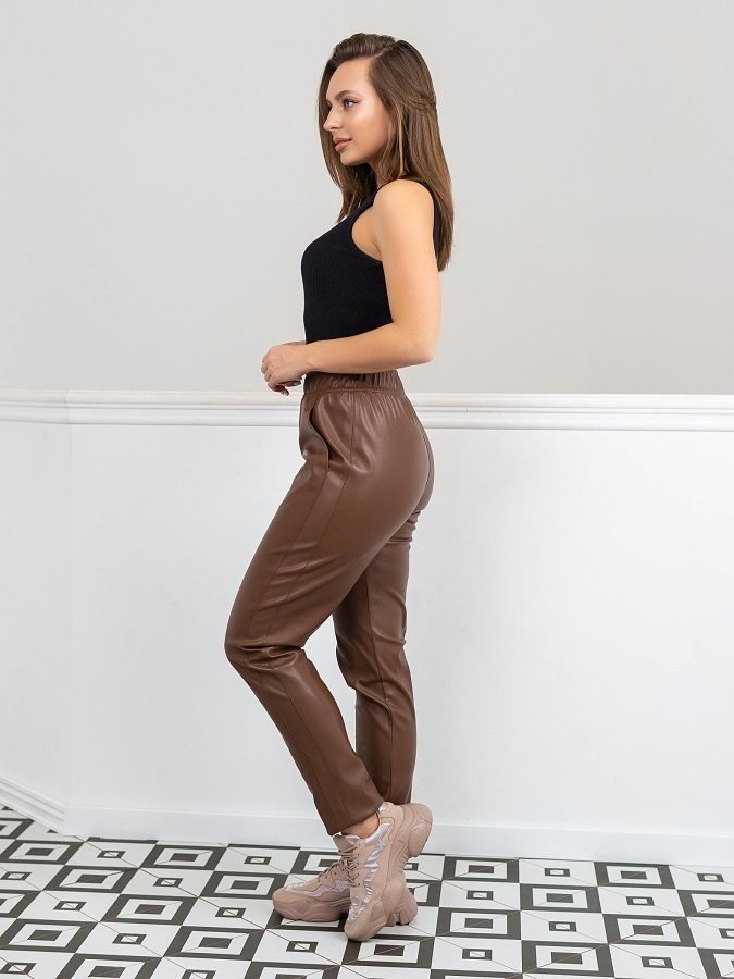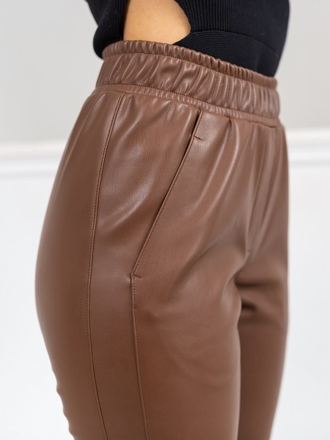 Зауженные кожаные брюки высокой посадки на эластичном перестроченном поясе. Декоративный гульфик, косые карманы по бокам. Подрез по ноге, переходящий в карман.