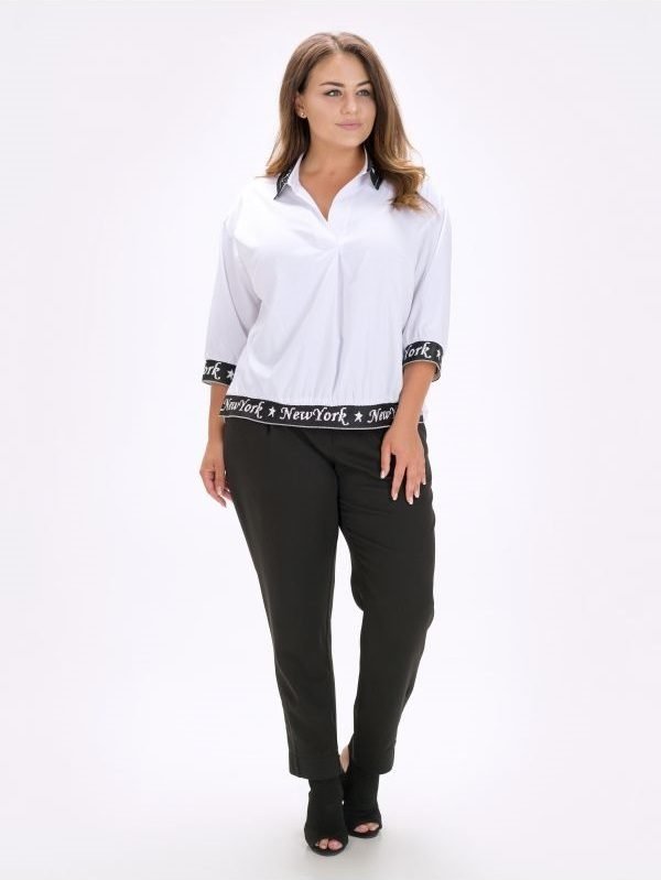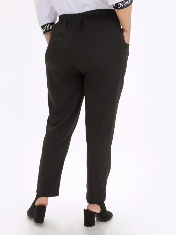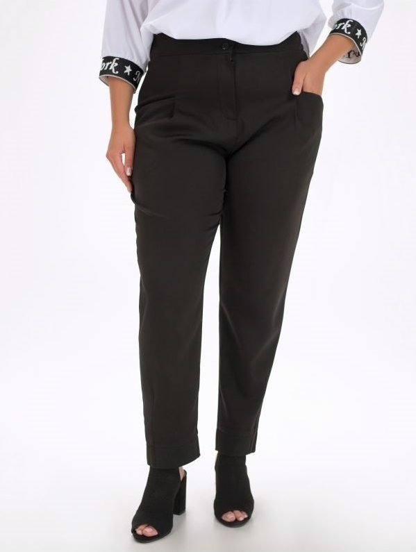 Брюки зауженные книзу высокой посадки. Притачной пояс, сзади - эластичная вставка. Застегиваются на пуговицы и молнию. Горизонтальные боковые карманы. Впереди на манжете эластичная вставка.