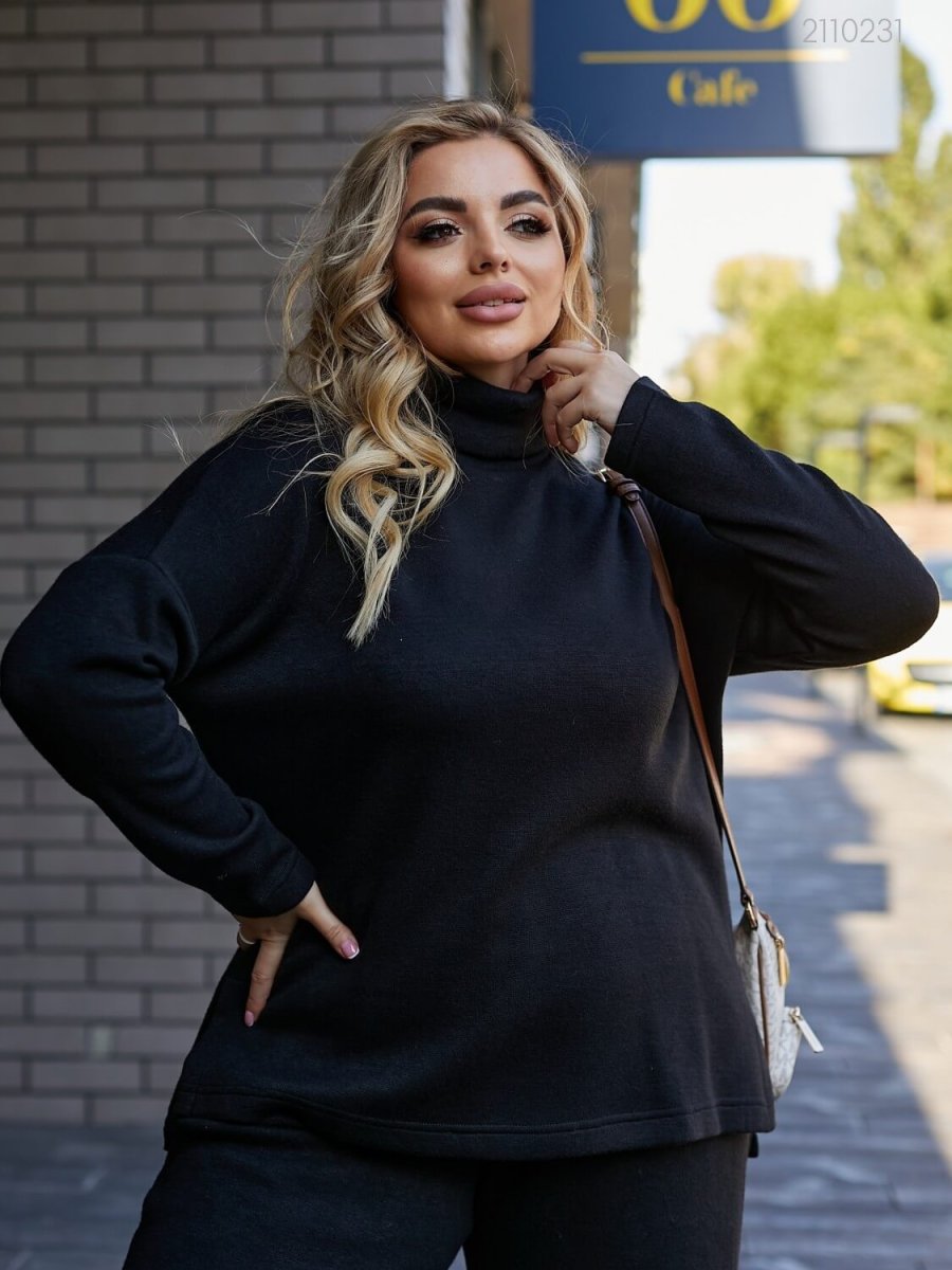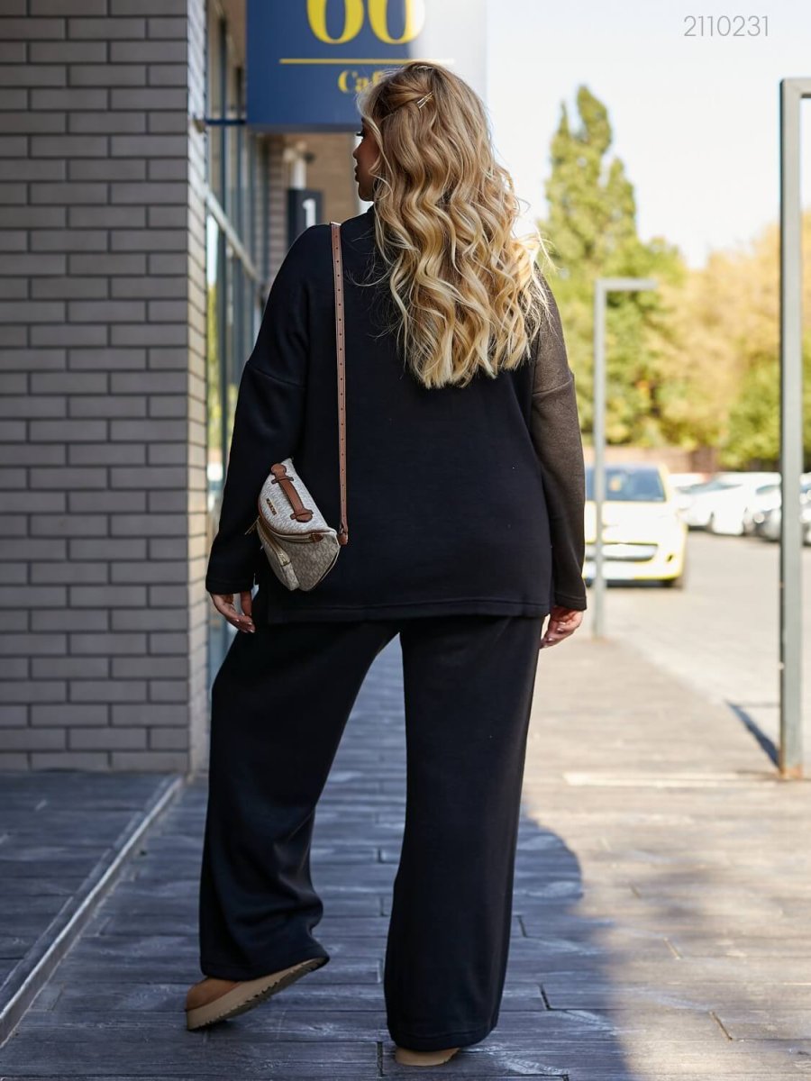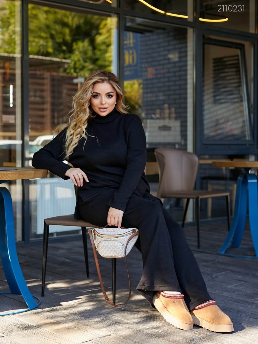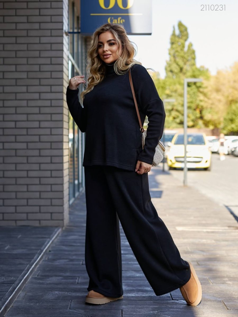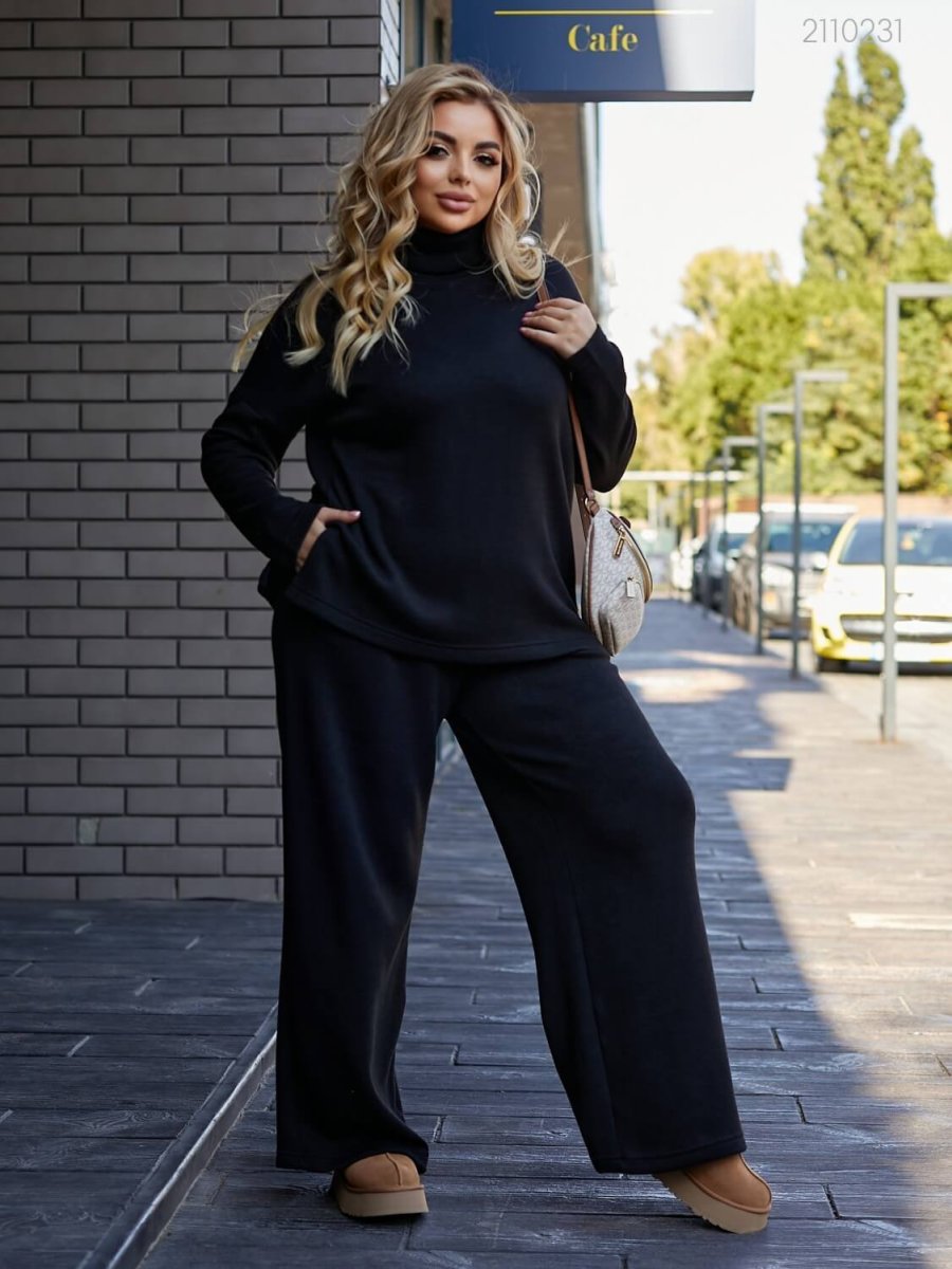 Подробности: кофта с высоким двойным воротником, спущенной линией плеча, асимметричной длиной. Брюки-палаццо высокой посадки с глубокими вместительными карманами, поясом на широкой резинке.