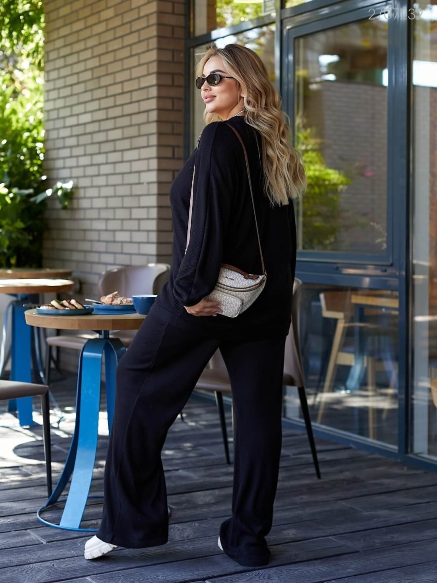 Подробности: кардиган свободного кроя с застежкой на пуговицах. Брюки-палаццо с поясом на широкой резинке с карманами в боковых швах.