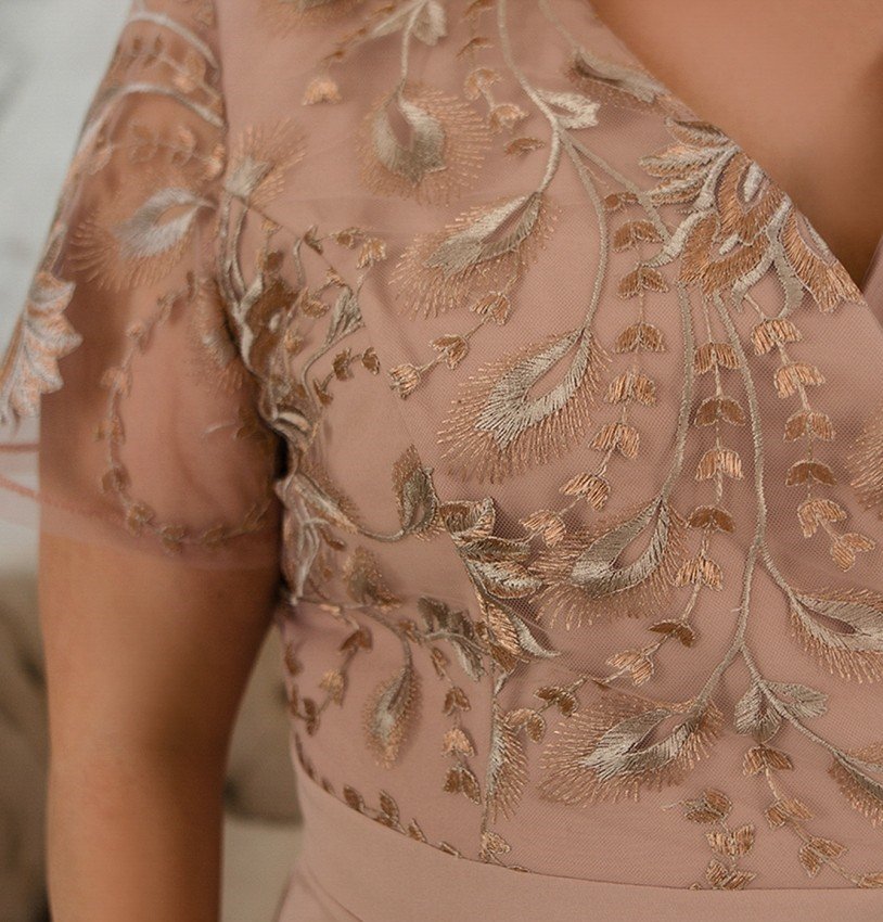 Привлекательное платье с ажурной нашитой на лиф сеточкой, украшенной вышивкой. Рукава полностью из прозрачной сеточки. На груди вытачки. Разделение подшито на спину, внизу вырез со вставкой-сеточкой, застежка - вшитая по спинке молния, сзади на подоле шлица.