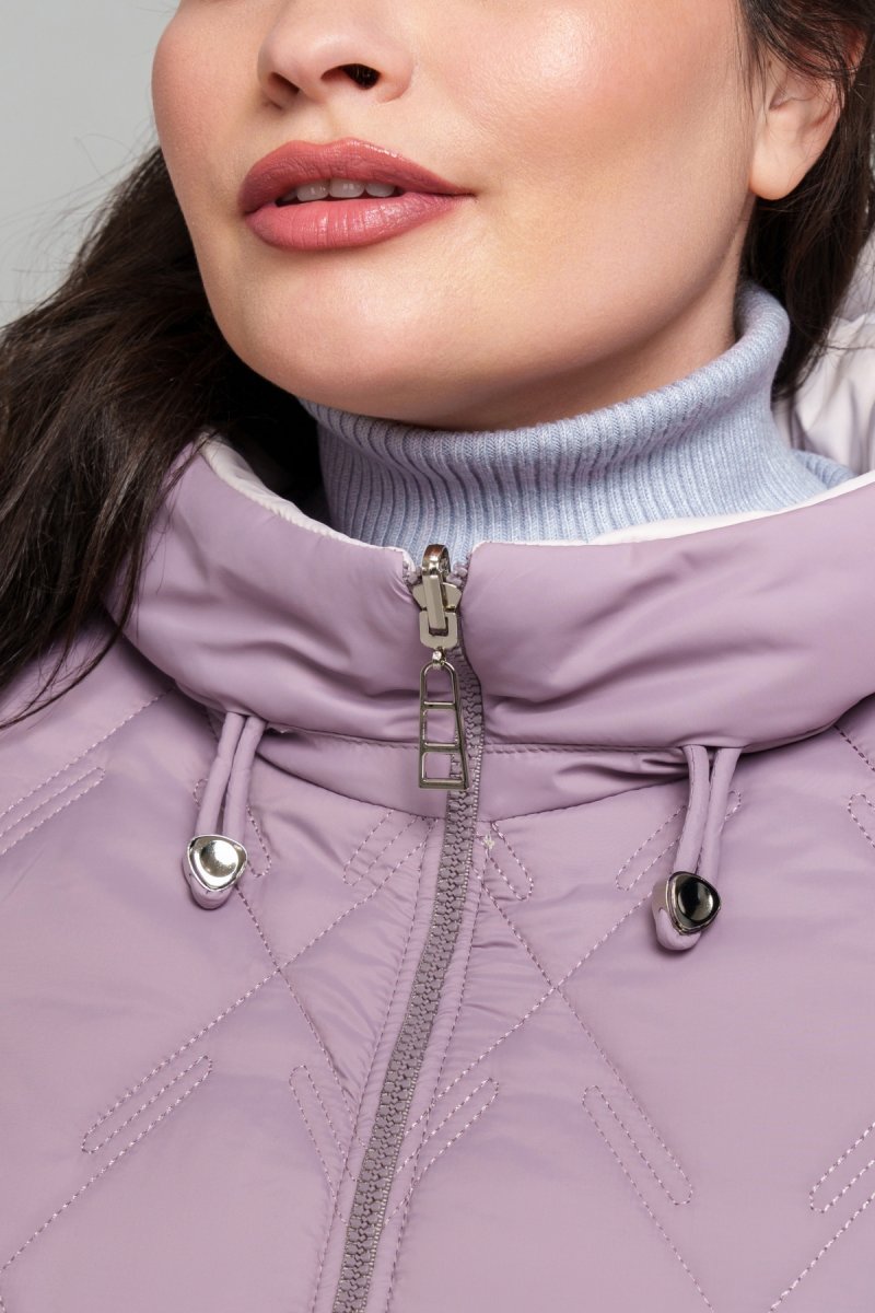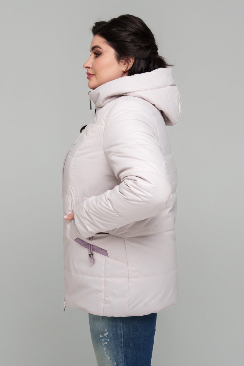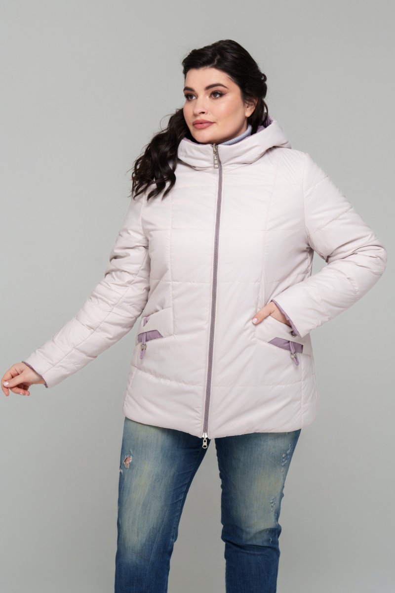 Куртка двухсторонняя, прямого силуэта, изготовлена из плащевки двух оттенков. Наполнитель тинсулейт 160 (г/м2). Рукав втачный, двухшовный. Капюшон втачный (несъемный), высота регулируется с помощью шнурка с зажимами. В рельефных швах полки выполнены в карманах, декорированных молниями. На внутренней стороне кармана декорированы шнурком с зажимами. Застежка на двустороннюю молнию.