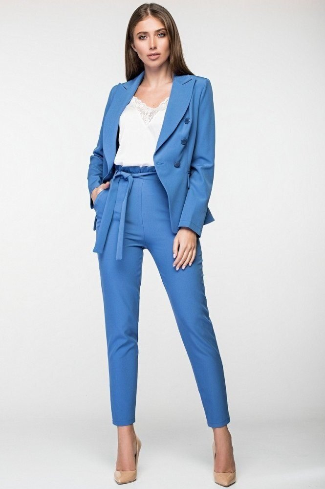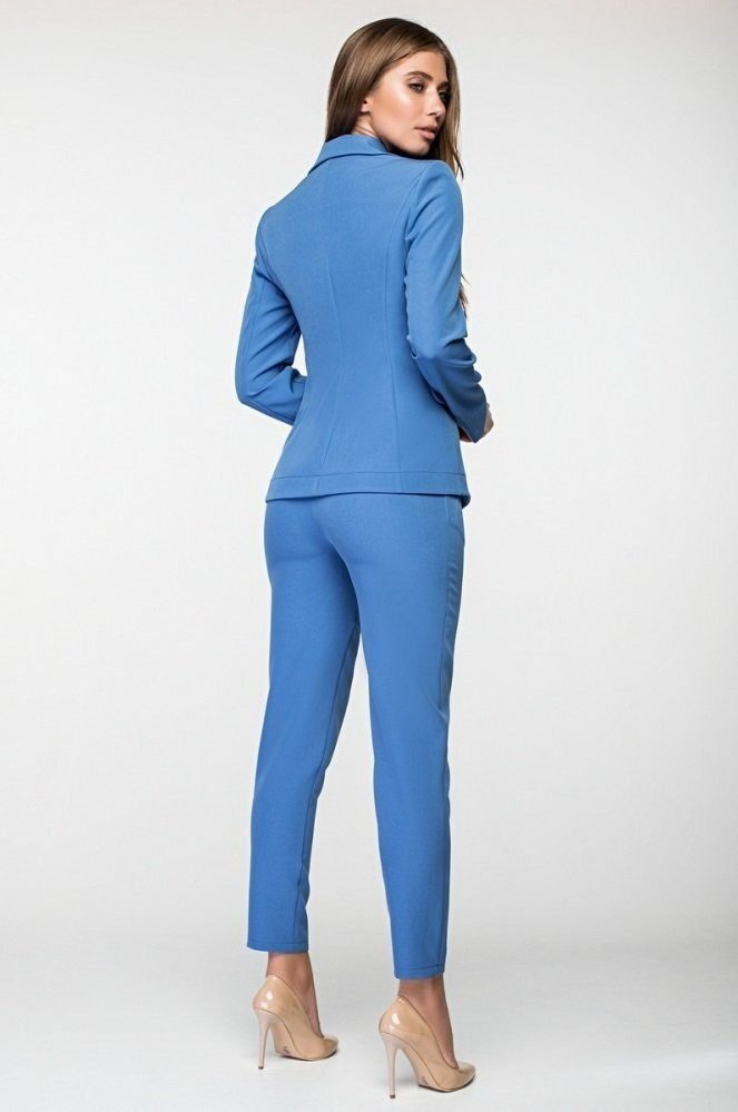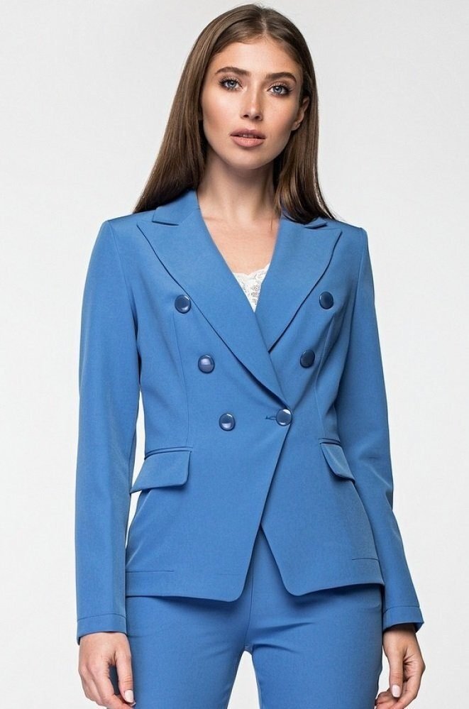 Двубортный жакет приталенного силуэта из костюмной ткани с карманами-обманками. Без подкладки.