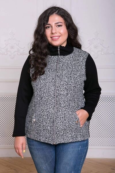 Кофта на основе комбинации двух тканей - полочки кофты выполнены из букле, а спинка и рукава из трикотажа "резинка". Воротник – стойка. Кофта застегивается на змейку. Хорошо сочетается с одеждой в стиле кэжуал.