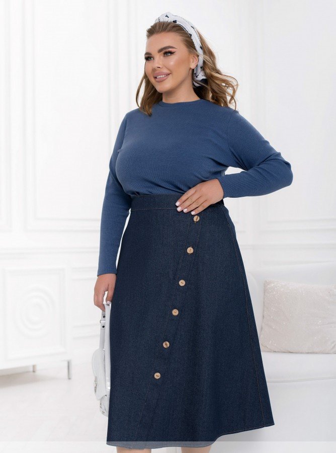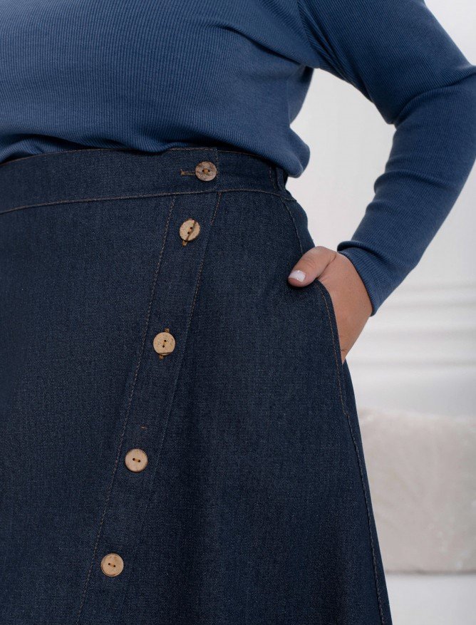 Женская юбка джинсовая меди станет вашим фаворитом в этом сезоне благодаря комфорту и универсальности, которые она подарит вам. Модель на резинке, вшитой в пояс по спинке, застегивается на ряд пуговиц спереди, а также дополнена удобными карманами в боковых швах.