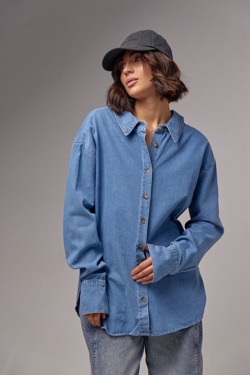 В модели края низа полукруглые. Круглая горловина идет с отложным воротником на короткой стойке. Острые уголки воротника присутствуют спереди и сзади. Проймы слегка опущены, а длинные рукава заканчиваются манжетами на пуговичке. На спинке, от воротника, спускается вертикальная строчка. Застегивается рубаха спереди на ряд пуговиц.