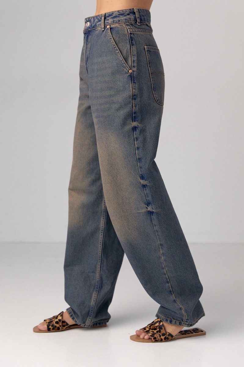 Эта модель к низу слегка заужена. Пояс в джинсах идет без резинки и с петлями для ремня. Застегивается модель спереди на молнию и пуговицу. Сзади на джинсах расположены накладные карманы, а спереди - прорезные карманы. На уровне колен есть декоративные швы, а на поясе, со стороны спинки, дополнительные лампасы, которые можно стягивать благодаря металлической пряжки.