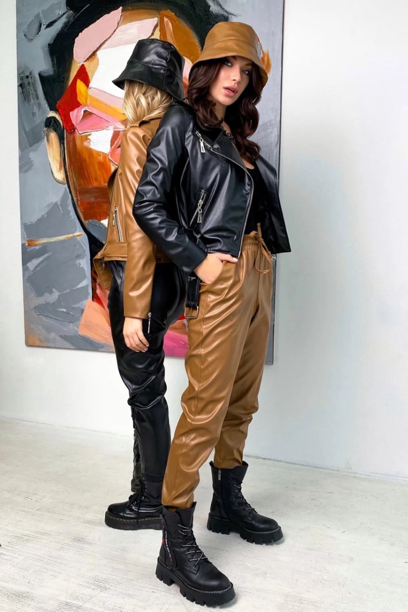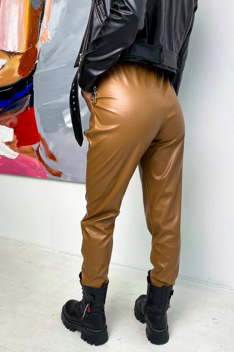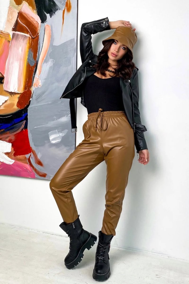 Свободные кожаные штаны. Пояс на резинке со шнурками. Манжеты на резинке. Высокая посадка. Карманы с отрезным бочком.