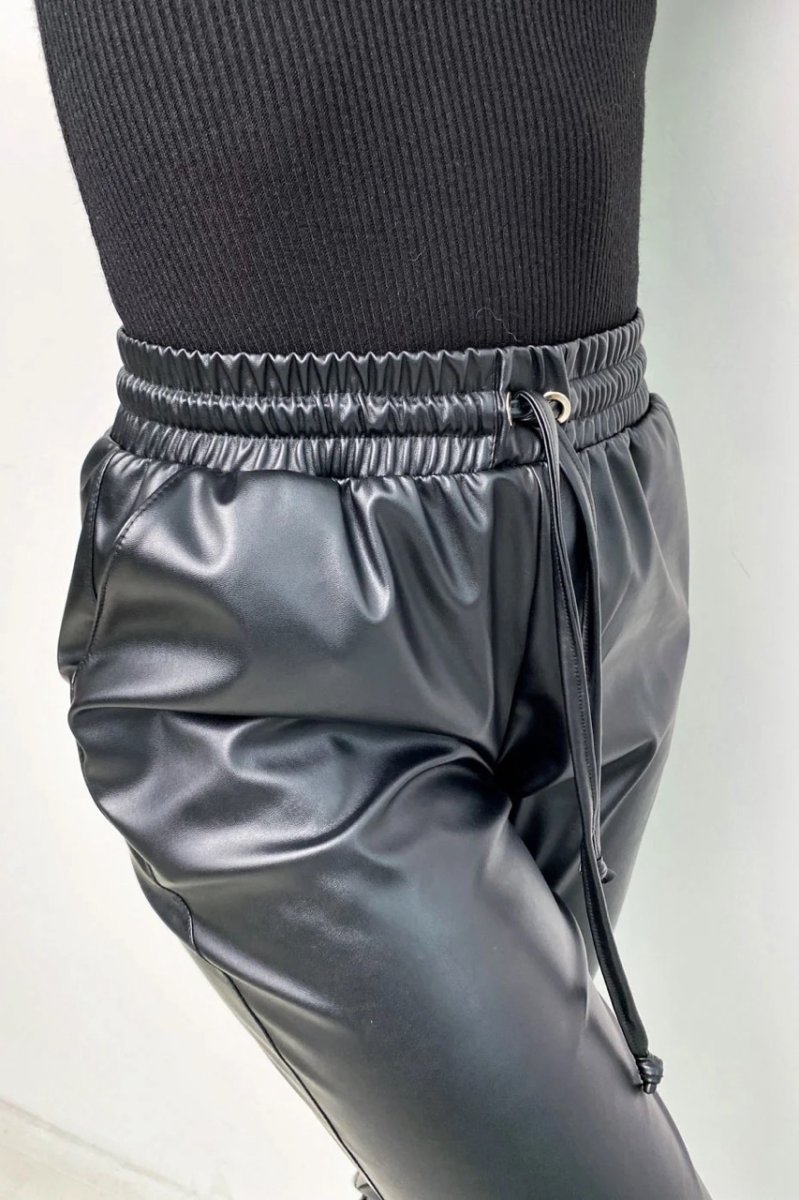 Свободные кожаные штаны. Пояс на резинке со шнурками. Манжеты на резинке. Высокая посадка. Карманы с отрезным бочком.