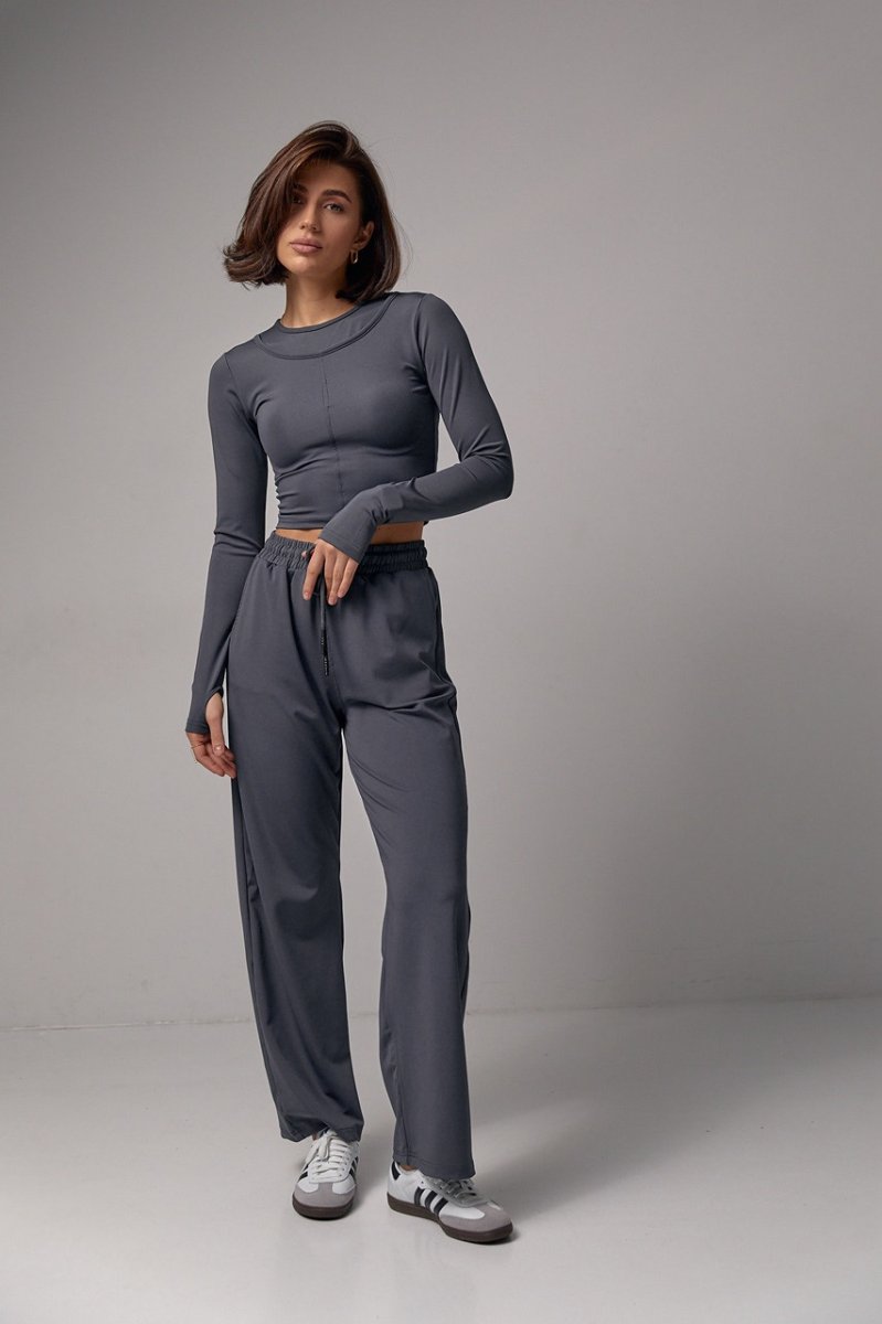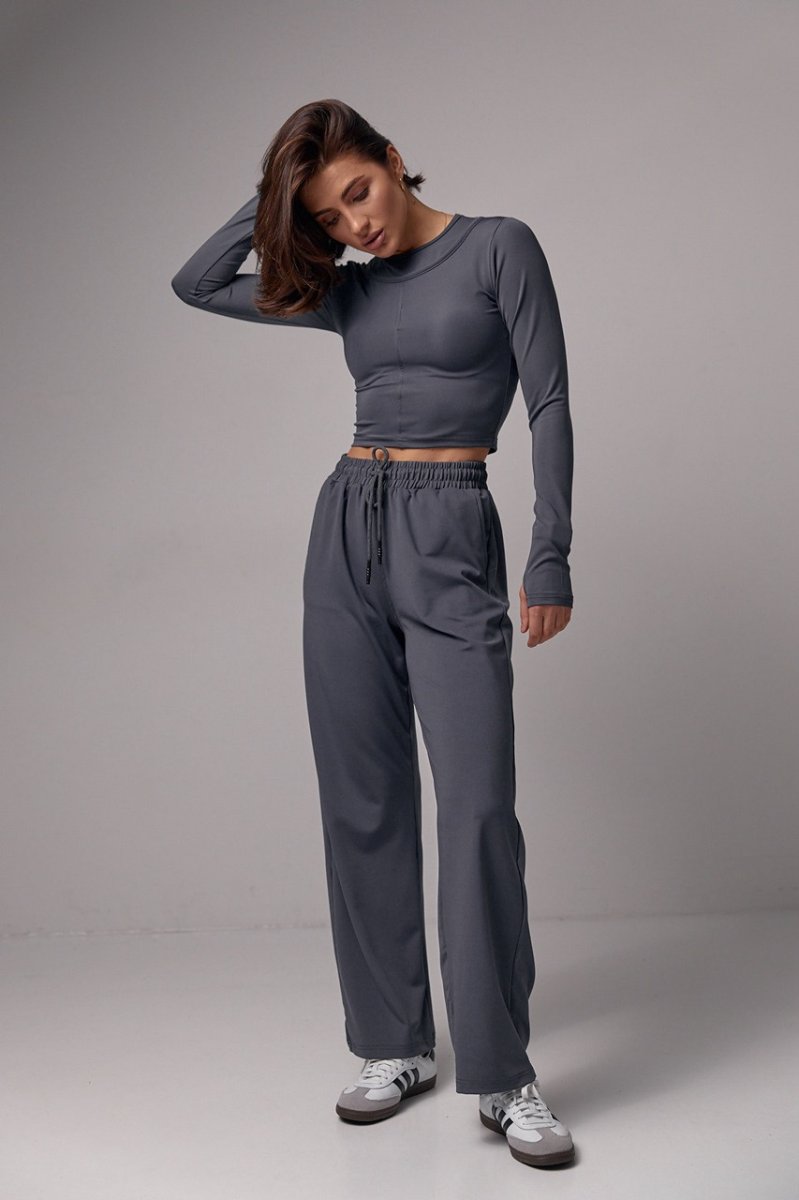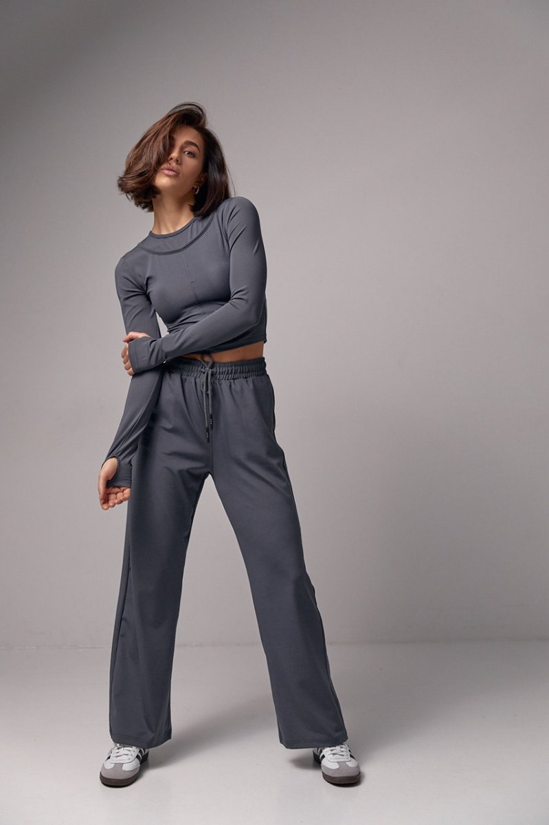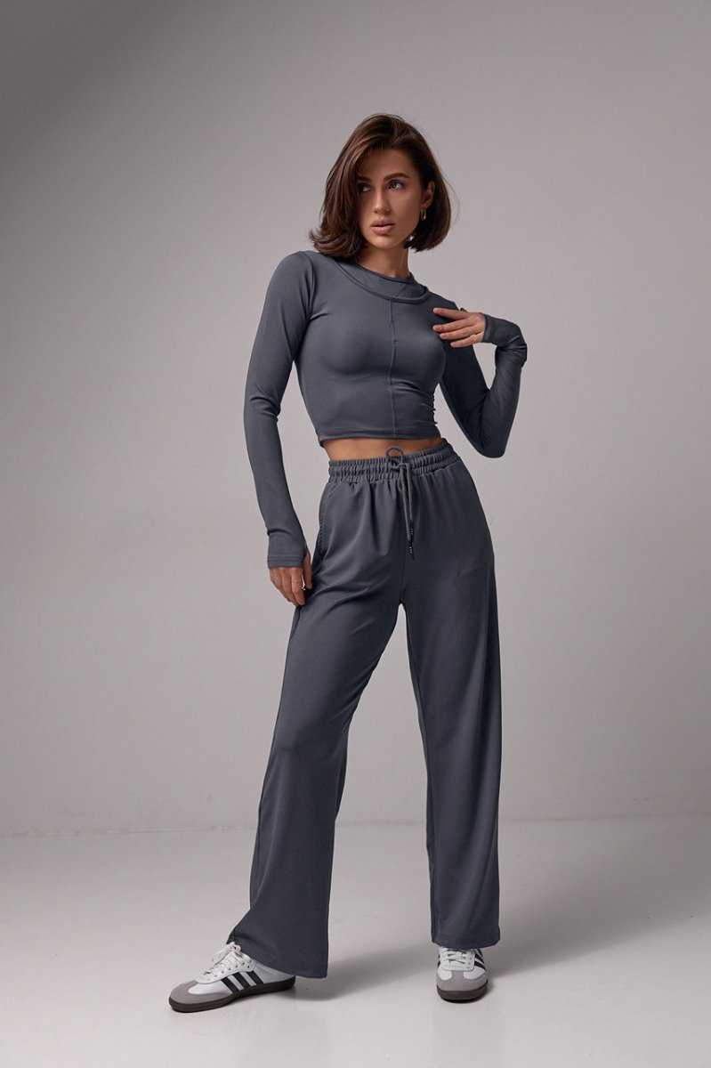 Штаны в комплекте имеют прямой крой, а вверху вшит широкий пояс с резинкой и завязками. Вверху, в боковых швах, присутствуют прорезные карманы. В укороченной кофточке рукава длинные, края низа прямые, а круглая горловина обшита бейкой в тон. Передняя часть кофты спереди украшена дополнительным вертикальным швом.