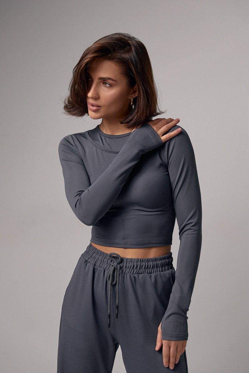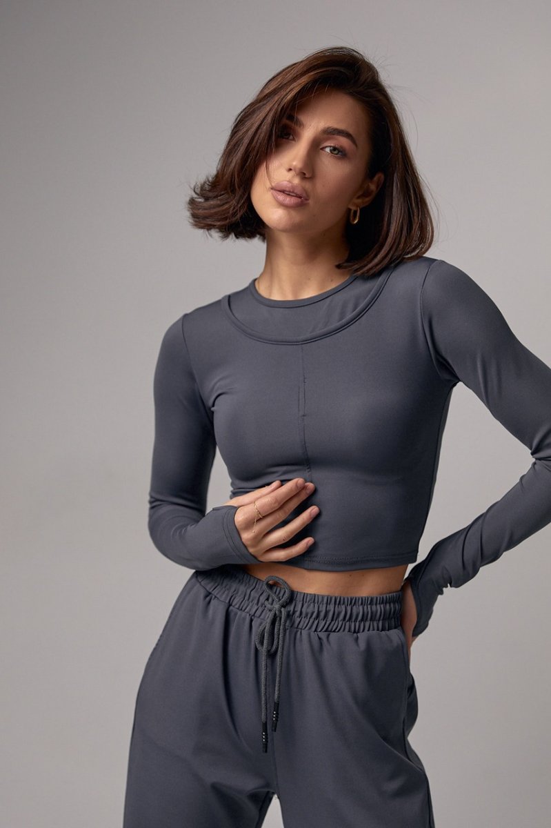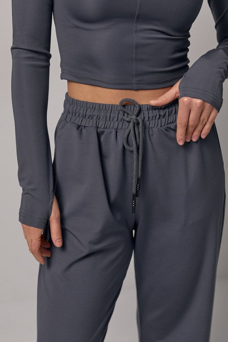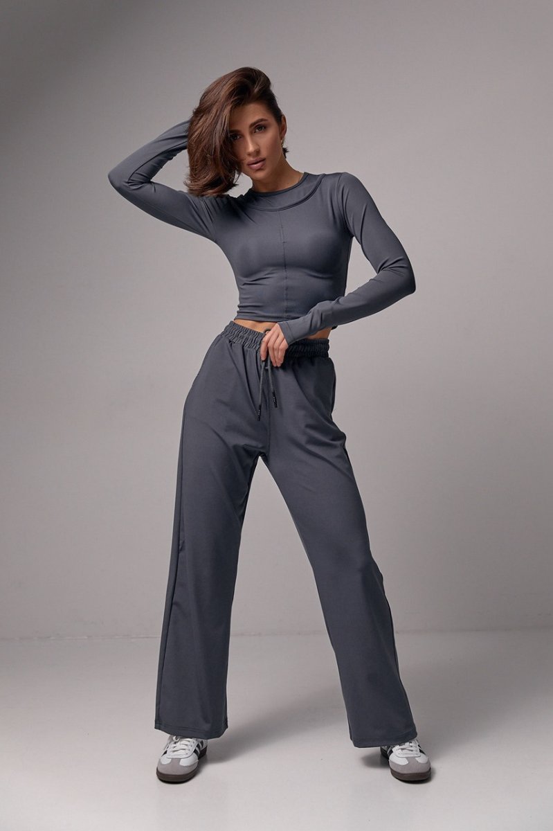 Штаны в комплекте имеют прямой крой, а вверху вшит широкий пояс с резинкой и завязками. Вверху, в боковых швах, присутствуют прорезные карманы. В укороченной кофточке рукава длинные, края низа прямые, а круглая горловина обшита бейкой в тон. Передняя часть кофты спереди украшена дополнительным вертикальным швом.
