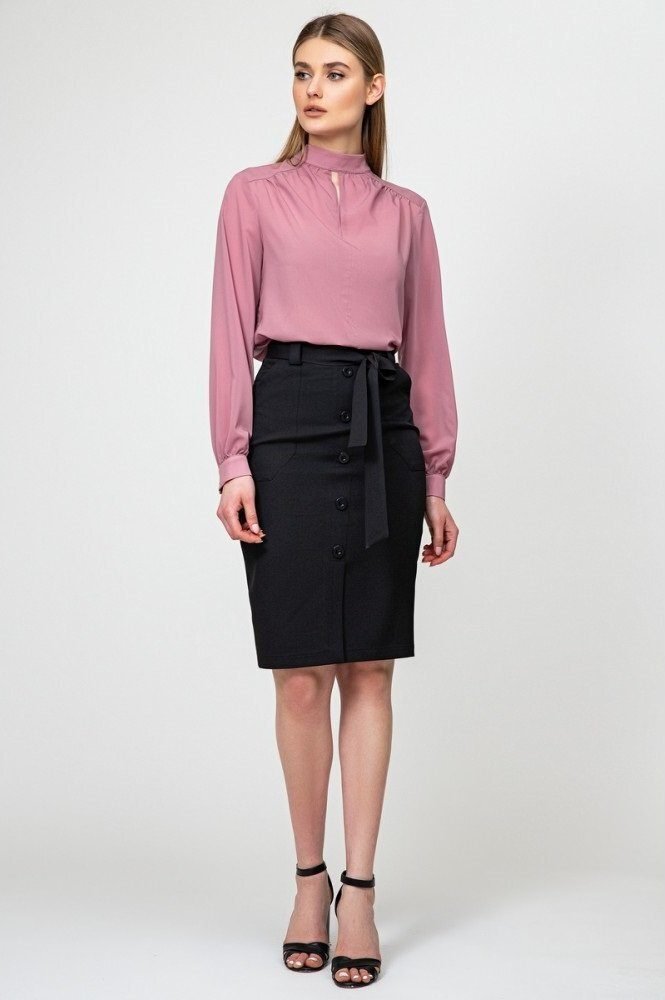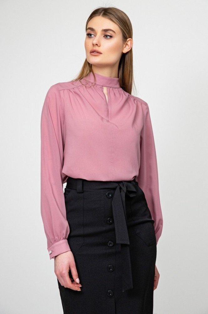 Элегантная шифоновая блуза с высоким воротником и бантом сзади.